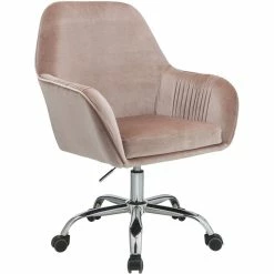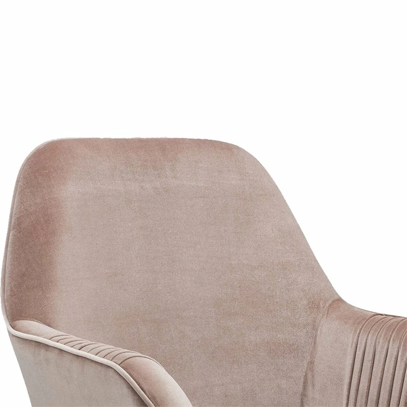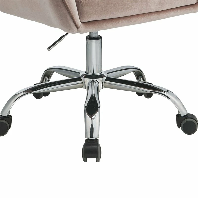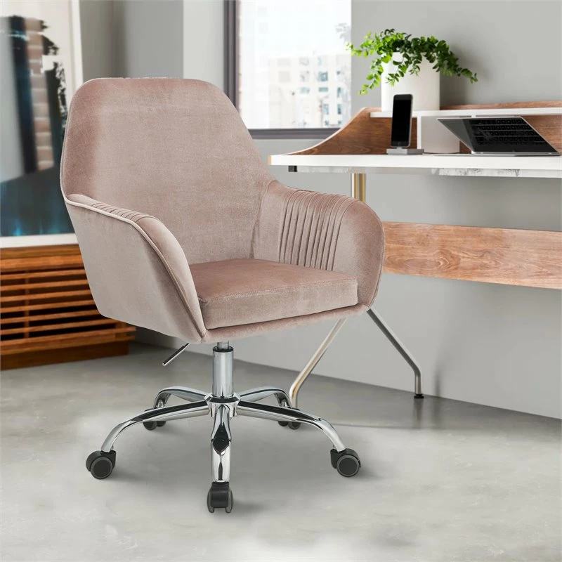 Create an impressive presence in your office space with this stylish office chair. Upholstered in peach velvet, the swivel chair features padded back and seat with tufting details on the flared armrest that accentuate its charm. The metal base has a height adjustment lever which allows you to adjust your seat height according to your requirement, while its five caster wheels offers effortless mobility. Add this chair to your home office or workspace to enjoy comfortable seating even after long hours of work.