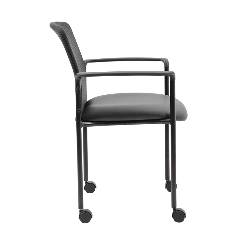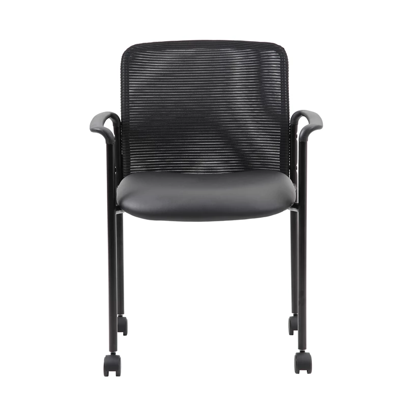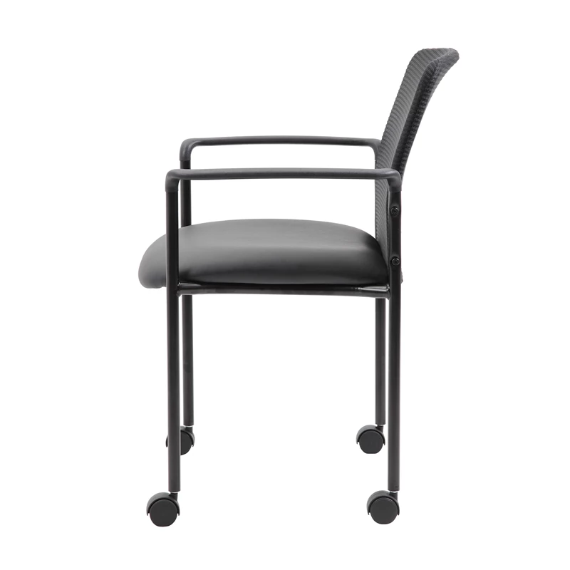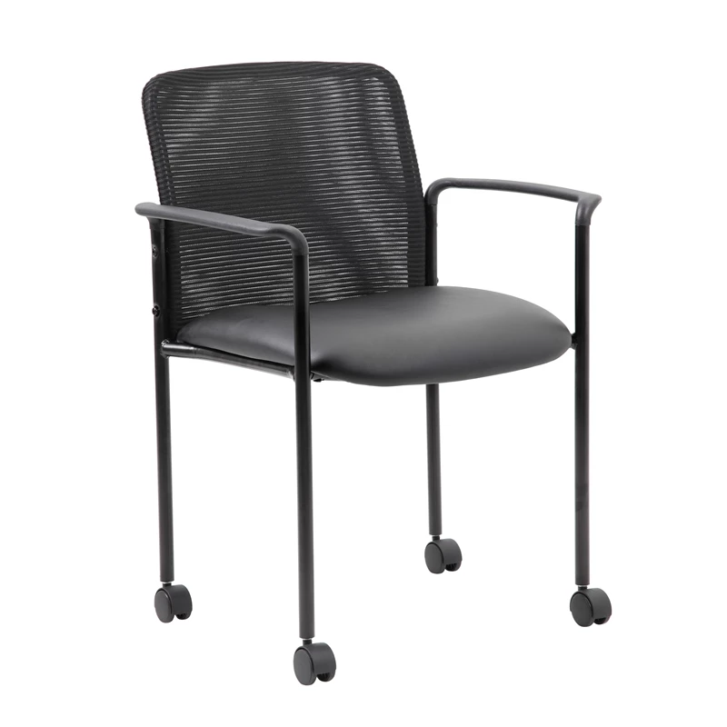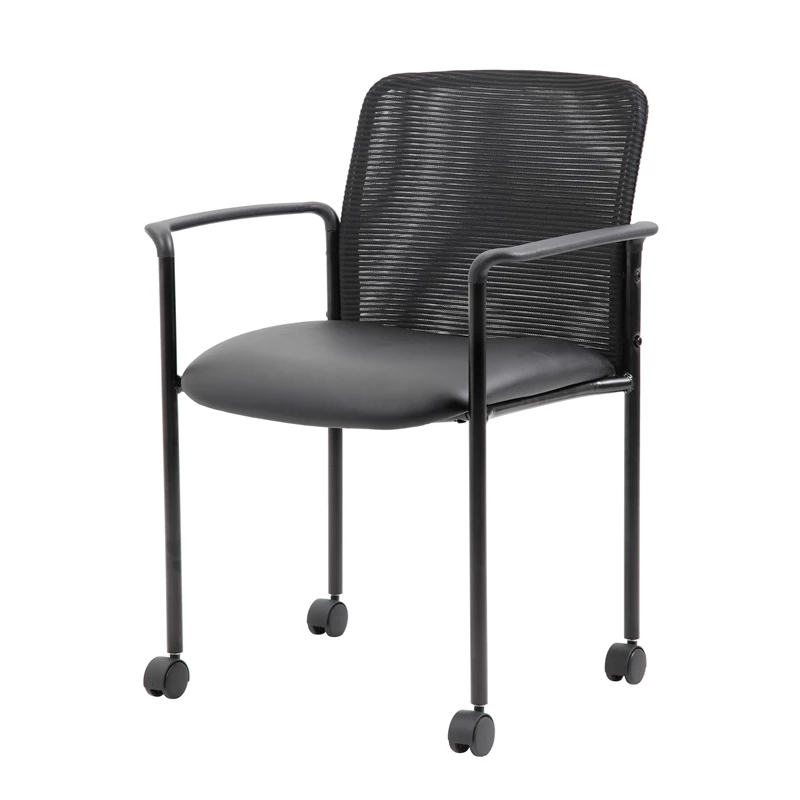 The stackable mesh guest chair in black is the perfect addition to any room or office. For smaller spaces, the chair can be stacked 4 high and stored away when not in use. The chair is at a fixed height with fixed arms and 4 hooded dual wheel casters and is designed with a mesh seat as well as a breathable, airy mesh back. The black chair adds a modern, professional appearance to any space and has a weight limit of 275 lbs.