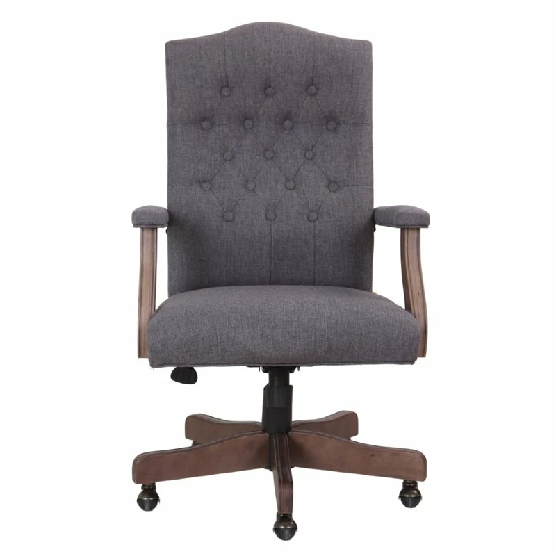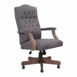 A classic executive chair design gets a modern face lift without sacrificing quality and comfort. The on-trend gray commercial grade linen upholstery and coordinating driftwood finish frame with antique brass finished caste make this high-back swivel office chair an obvious fit in your work place or home office. Adjust the height of the chair to accommodate your needs throughout the day. Crafted with a sturdy wood frame and featuring a wide base for durability, you can enjoy this chair at your desk for years to come.