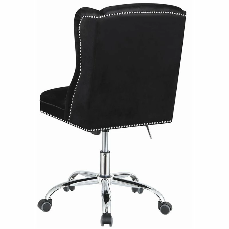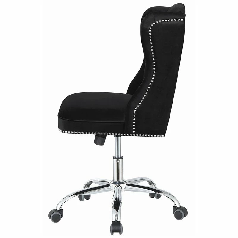 Plush, stylish, and easily adjustable, this office chair is an instant upgrade to any workstation. Upholstered with smooth, sumptuous black velvet, it’s exquisitely soft to the touch. Cool, silver nailhead trim pleasingly blends with its high-shine chrome base. Elegant button tufting lends an understated touch of sophistication. Complete with swivel functionality and a comfy padded seat, this chair is a cozy and versatile choice.
