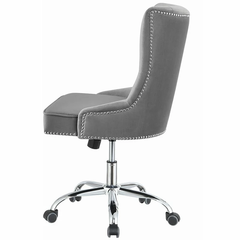 Add versatile convenience to your workspace with this stunning swivel office chair. With built-in casters and handy height adjustability, it allows you to perfectly position yourself for productivity. The luxurious texture of gray velvet upholstery infuses it with exquisite comfort. Shiny, round, silver embellishments adorn its base and armrests, while button tufting adds a chic element of style. Its shining chrome base pulls its luxe look together in spectacular fashion.