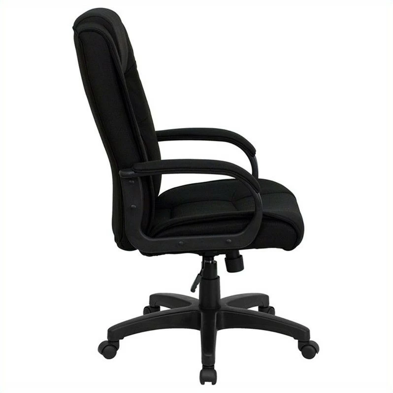 Whether you’re powering through your workday or just browsing the internet, this executive swivel office chair is just what you need. Featuring black fabric upholstery, built-in lumbar support and a contoured back and seat, this high back chair is perfect for your office or home office. High back office chairs have backs extending to the upper back for greater support. The high back design relieves tension in the lower back, preventing long term strain. The contoured seat dissipates pressure points for greater comfort. The tilt lock mechanism rocks/tilts the chair and locks in an upright position while the tilt tension adjustment knob adjusts the chair’s backward tilt resistance. Chair easily swivels 360 degrees to get the maximum use of your workspace without strain. The pneumatic adjustment lever will allow you to easily adjust the seat to your desired height.