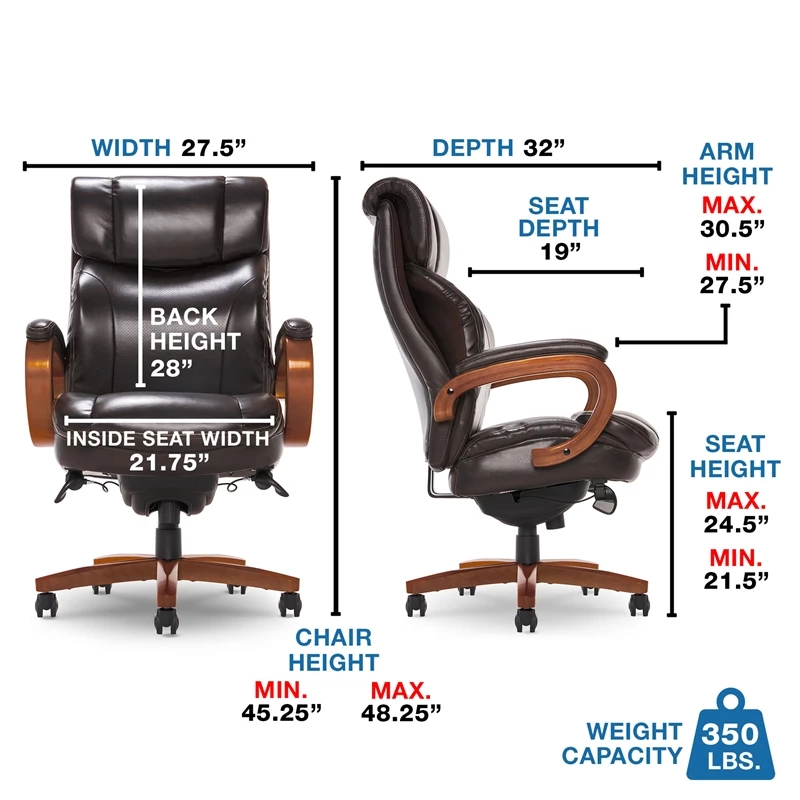 The La-Z-Boy Big and Tall Trafford Executive Office Chair combines a timeless design with premium comfort to add a refined look to any office space. This big and tall leather office chair delivers all the extra room you need at your desk. It features memory foam ComfortCore cushions that contour to your body and AIR Lumbar Technology to support your back at every angle. Soft, padded armrests and adjustable height, recline, and tilt functions allow you to find the perfect settings to stay comfortable all day. The brown bonded leather upholstery and darkly stained wood construction are an ideal complement for any classically styled office, giving you the ideal mixture of sophistication and support in an ergonomic office chair.