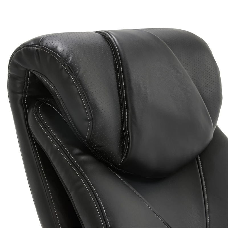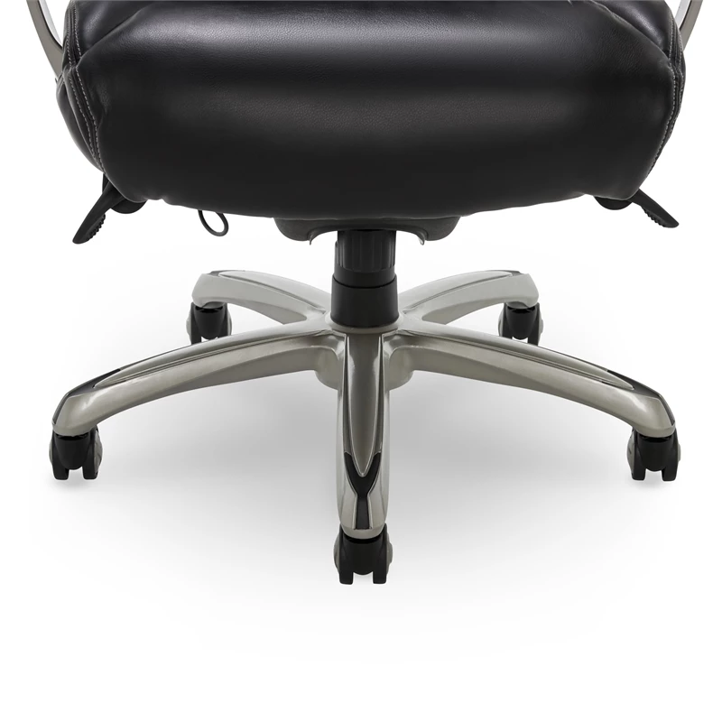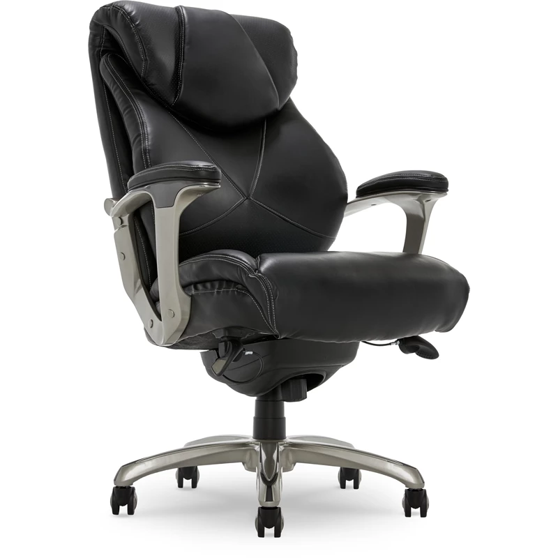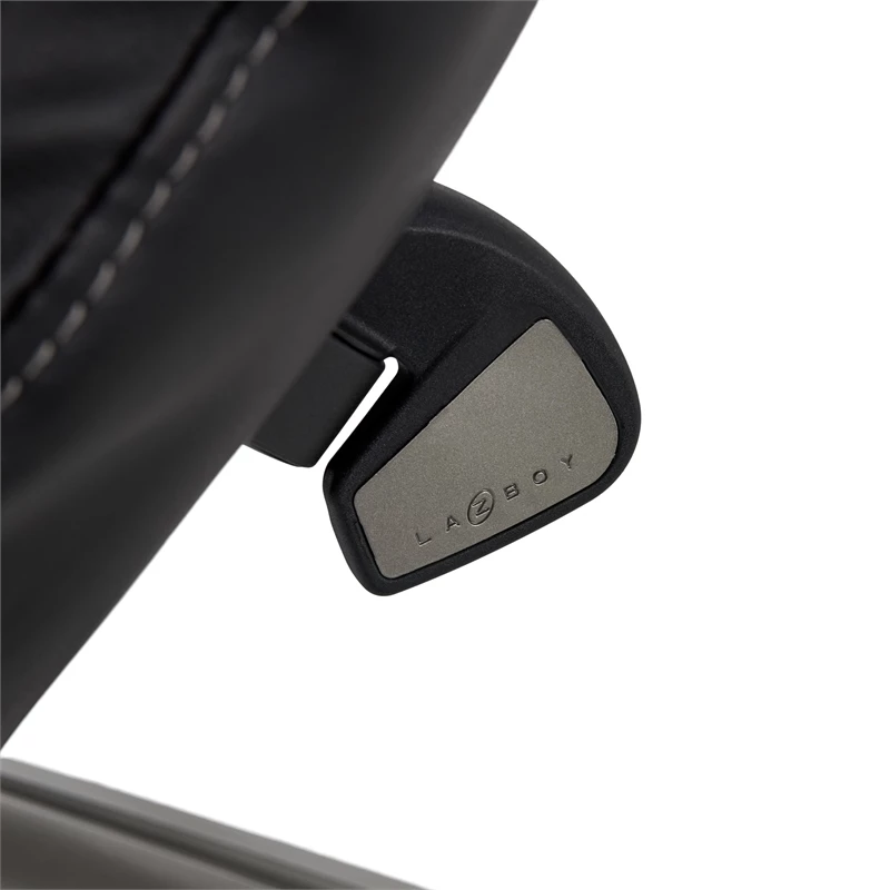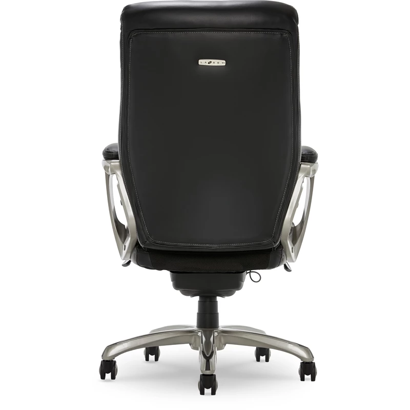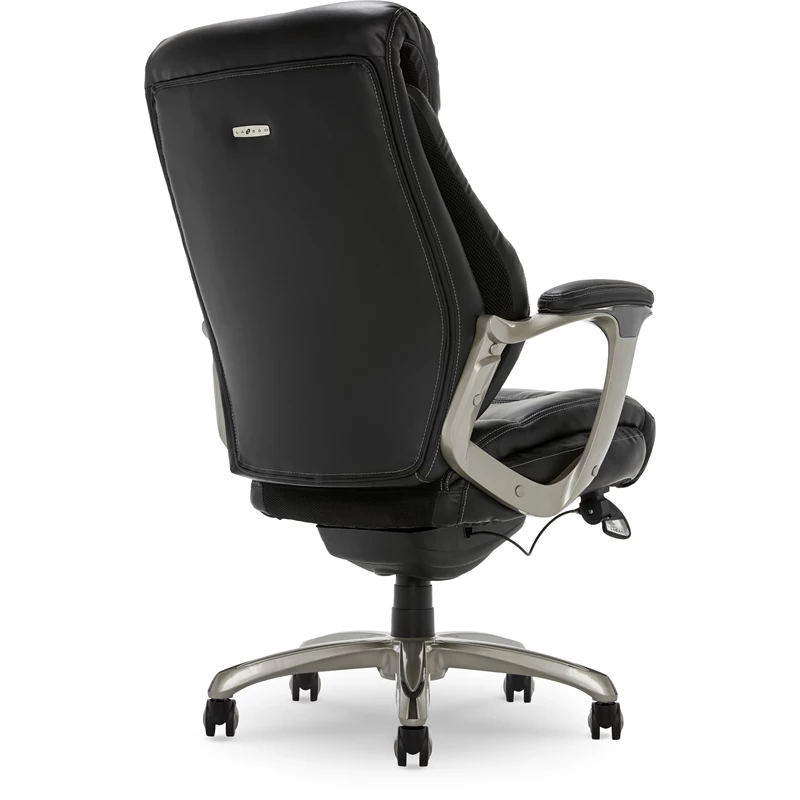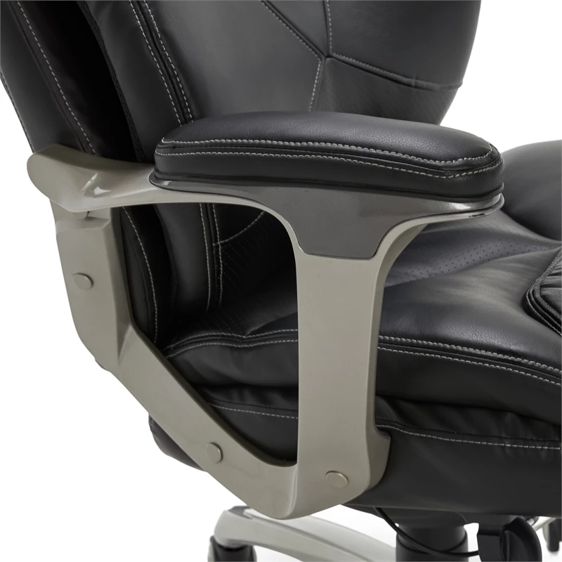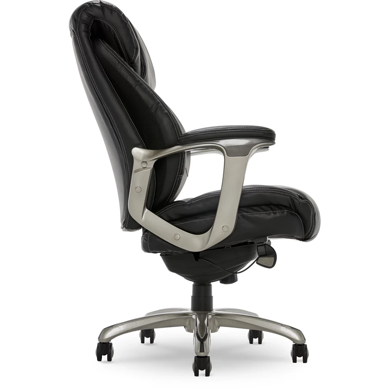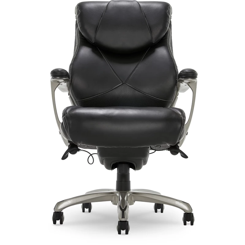 Combining advanced comfort technology with a timeless style, the La-Z-Boy Cantania Executive Office Chair is a smart choice for any office, home, or entertainment space. This La-Z-Boy office chair features flexible AIR Lumbar Technology that pivots and conforms to the lumbar area according to your movement, helping to improve posture and reduce discomfort. It is also designed with Comfort Core Plus memory foam cushions—an advanced layering system that offers zone-based support with cushioning in the areas you need it most. The strategically placed plush body pillows and padded headrest combine to provide neck support and minimize pressure points, helping you feel more rested after long days at work. The ergonomic chair is fully adjustable for optimized body alignment. Crafted with silver painted components, this high-back office chair with hand-sculpted arms is upholstered in soft bonded leather to deliver comfortable, contemporary style to any work space.