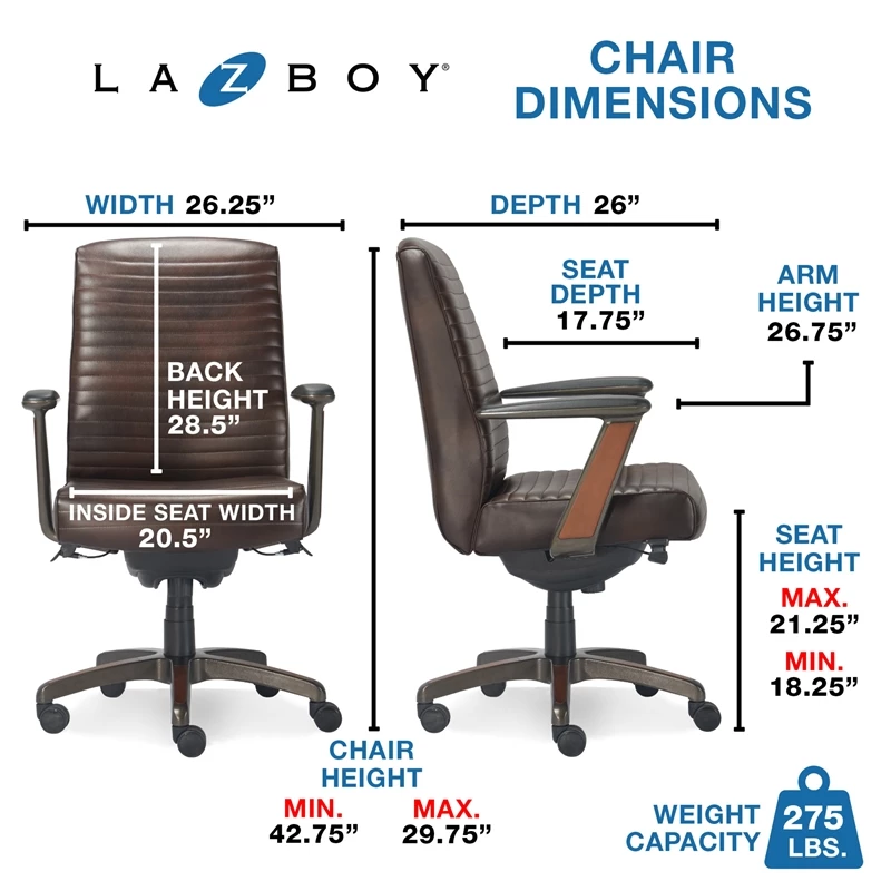 Fitting with your modern lifestyle, this La-Z-Boy office chair showcases clean lines, contemporary color and overall city sensibility. Smooth bonded leather offers sleek seating while maintaining a high-end look. Set on a sturdy wheeled base, this executive office chair moves with ease from a day of work at your desk to your living room for a night of gaming. The ergonomic design, full cushion foam and high back with lumbar support keep you comfortable and energized through every moment. This ergonomic office chair allows you to adjust the height, tilt and lift to suit your sit positioning and give you an optimized body alignment. La-Z-Boy chairs are designed to put your comfort first with quality that’s built to last so your work day is always engaged and productive. No wonder we’re the industry standard for comfort and style.