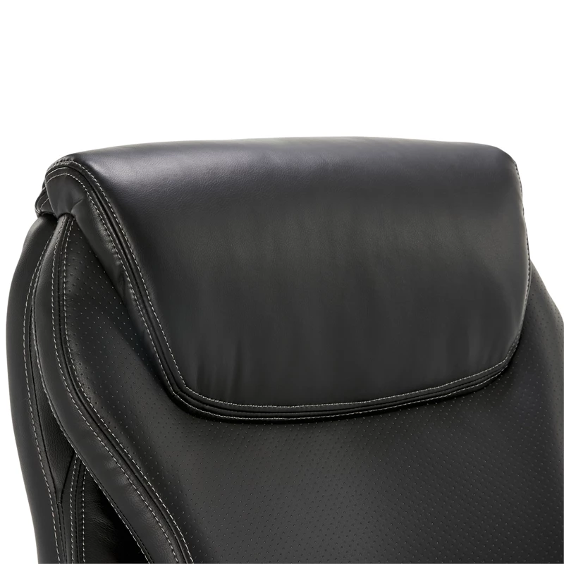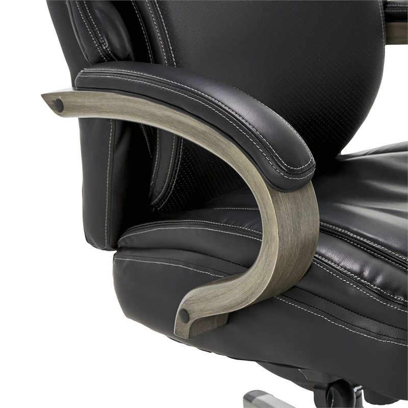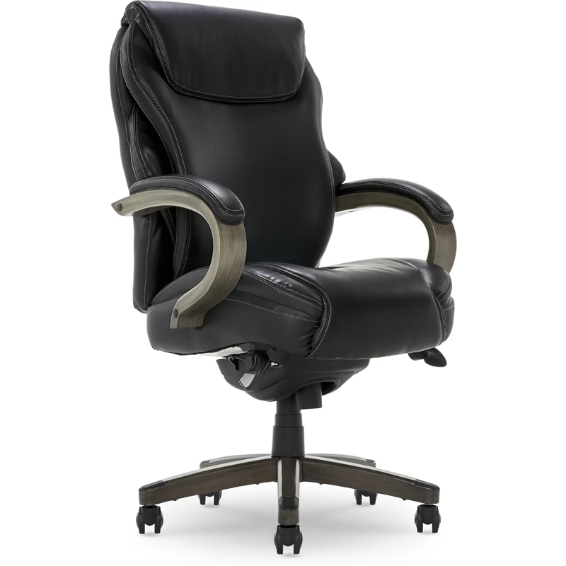 Add a sophisticated flair to any office space with the La-Z-Boy Hyland Executive Office Chair. This black leather office chair features a flexible AIR lumbar system that pivots to provide back support whenever you shift. Layered memory foam cushions contour to the body for continued comfort. Soft, padded armrests and adjustable height, recline, and tilt functions allow you to find the perfect settings to stay comfortable all day. With high-end finishes like soft bonded leather upholstery and elegant solid wood detailing, this ergonomic office chair offers the ideal blend of style and support for any workspace.