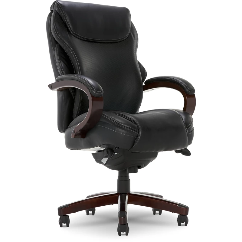Add a sophisticated flair to any office space with the La-Z-Boy Hyland Executive Office Chair. This black leather office chair features a flexible AIR lumbar system that pivots to provide back support whenever you shift. Layered memory foam cushions contour to the body for continued comfort. Soft, padded armrests and adjustable height, recline, and tilt functions allow you to find the perfect settings to stay comfortable all day. With high-end finishes like soft bonded leather upholstery and elegant solid wood detailing, this ergonomic office chair offers the ideal blend of style and support for any workspace. This La-Z-Boy Hyland Modern Metal Executive Office Chair Black Bonded Leather will undoubtedly be a great addition to your home décor.