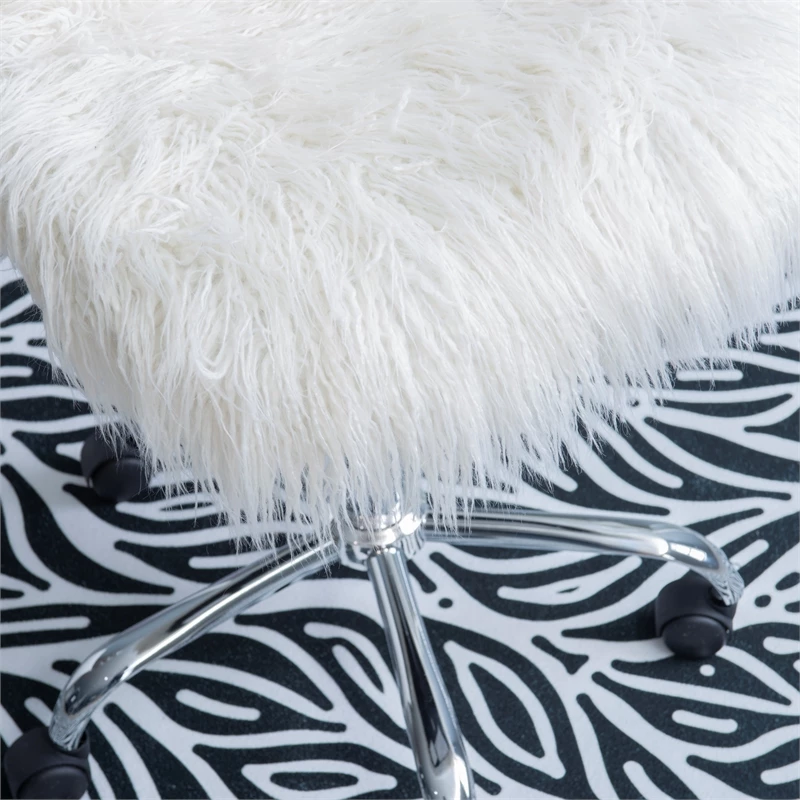 Add fun style and function to a desk or table with the Faux Flokati Armless Office Chair. The chair features faux fur upholstery on both the seat and back and is set upon a sturdy chrome base. Easy-roll casters allow you to move about your office space with ease, while the height-adjustable seat allows the chair to work with a variety of table heights. Perfect for a home workspace or added touch of personality in a dorm room.