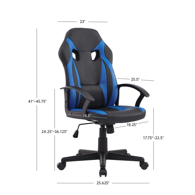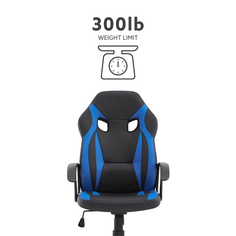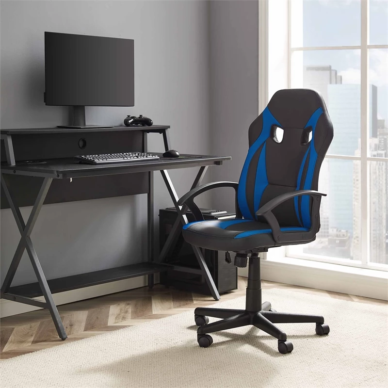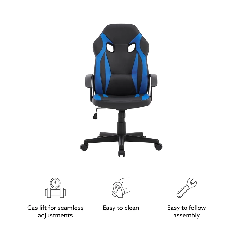 Whether you’re strapping in for an all nighter or just dropping by for a quick round, this gaming chair provides all of the necessary ergonomic support and mobility to keep you in the zone. The high backrest and foam seat cushion are upholstered in blue and black faux leather upholstery for extra comfort, easy cleaning and a bit of pizazz. Adding to overall convenience is a gas lift that allows for seamless height adjustments as well as holes in the headrest for extra ventilation and the option to attach a pillow.
