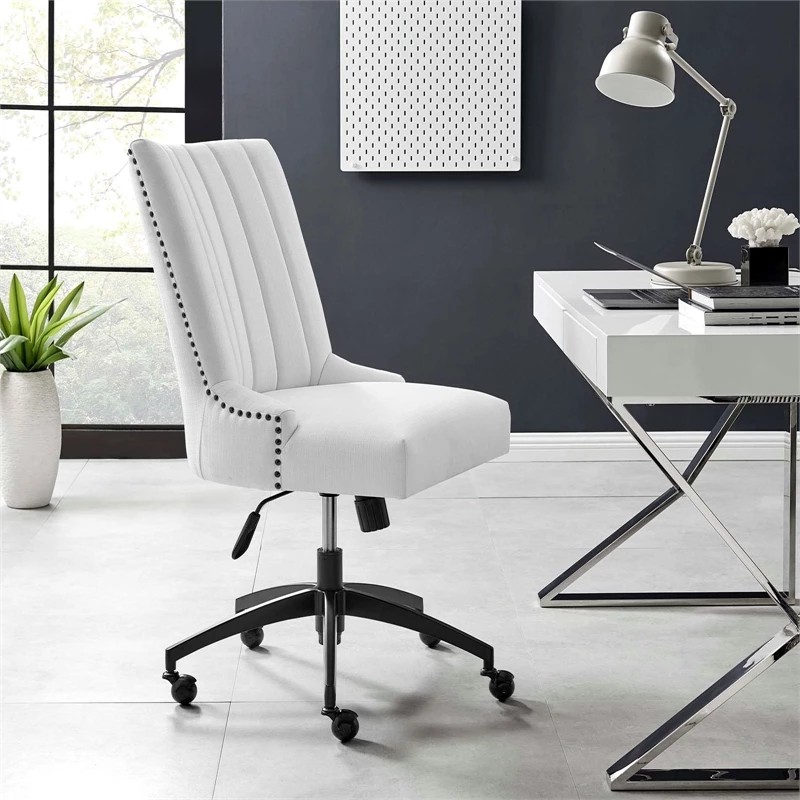 Inspire productivity in the workplace with the Empower channel tufted fabric office chair. Nailhead trim and channel tufting bring retro modern style to this office chair while dense foam padding and soft polyester fabric upholstery offer exceptional comfort and support during the workday. A matte black metal base and five single ball casters provide easy movement over hardwood or carpeted surfaces while a full 360º swivel, tilt tension control, and pneumatic height adjustment allow for personalized customization. Designed for the modern home or office, this upholstered desk chair is a stylish and functional addition to any workspace.