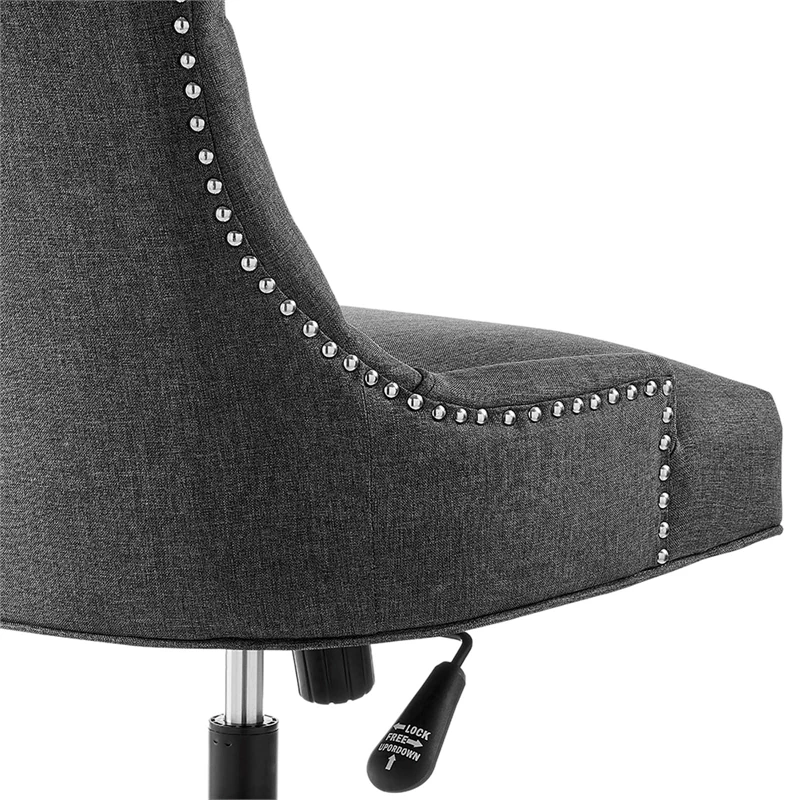Introduce vintage flair and glam deco appeal with the Regent tufted fabric swivel office chair. Metal nailhead trim and tufted buttons provide visual depth, while a luxuriously padded upholstered fabric back and seat for exceptional support to this superbly constructed computer desk chair. A matte black metal base and five single ball nylon casters provide easy movement over hardwood or carpeted surfaces while a full 360-degree swivel, tilt tension control, and pneumatic height adjustment create a custom seating experience for optimal performance. Perfect for the modern home or office, this fabric office chair is a desirable addition to any workspace.