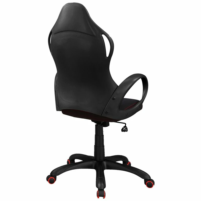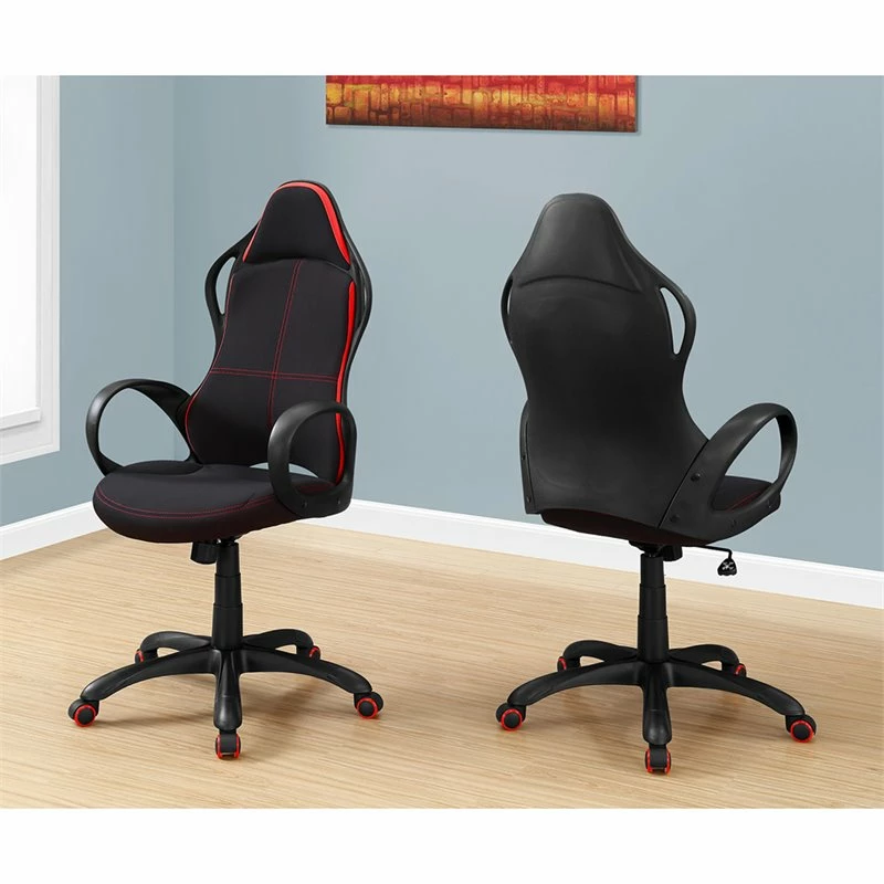 Get ready to bring your gaming to the next dimension with this ultra-modern office chair in a rich black finish with red accents to bring out the cool factor. This BIFMA certified swivel chair is upholstered in commercial grade breathable polyester fabric, with thick cushioning along the ergonomically curved back and seat for ultimate comfort. The sleek rounded armrests tie it all together for this race car inspired chair design. Easily adjust the seat height with the convenient side lever and sit back and relax with the tilt lock-in / free mechanism. The 5 eye-catching nylon castors smoothly glide across the floor for easy mobility.