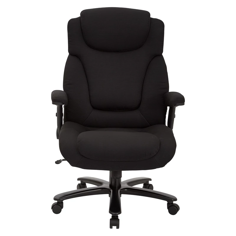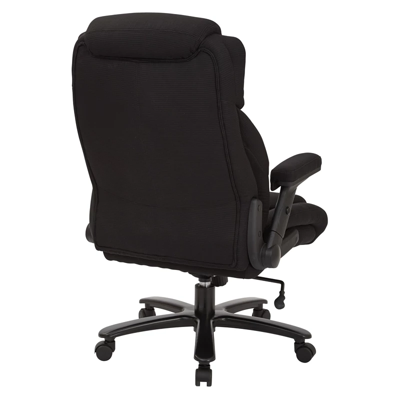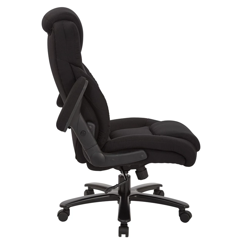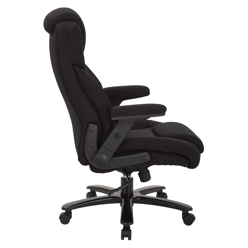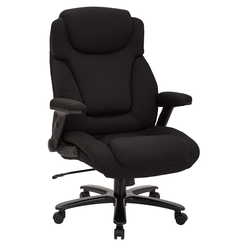 Big and Tall Deluxe High Back Black Fabric Executive Chair with Padded Flip Arms A true heavy-duty option in office seating, this big and tall office chair offers a luxurious seating experience. Sit back into the comfort of the thick padded contour seat with built-in lumbar support to cradle and protect your back. Enjoy the generous 400-pound weight capacity and multiple adjustments that allow for complete customization to support your work style. Get the support you need with the Big and Tall Deluxe Black Fabric Executive Chair.