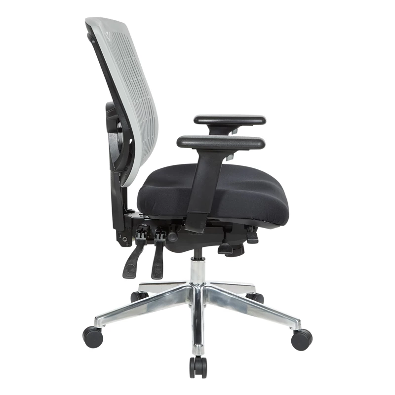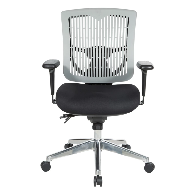 Contoured Gray Plastic Back Manager’s Chair Work in comfort and style in the new Pro-Line II® Multi-Function Chair. Perfect for workers who spend extended periods of time at their work stations, this intelligently designed chair provides comfort and support to both your body and mind. The contoured plastic back with built-in lumbar support and high-quality foam seat affords for hours of cozy seating, minimizing fatigue and alleviating pressure on the spine. The one-touch pneumatic seating adjustments allow you to elevate to the perfect height while the deluxe Multi-function control with forwarding tilt lets you adjust the seat and back angles to help reduce fatigue in your back and thighs. Complete with height adjustable arms with soft PU pads and a Chrome base with dual wheel carpet casters that provide for effortless mobility across tile and carpet floors alike.