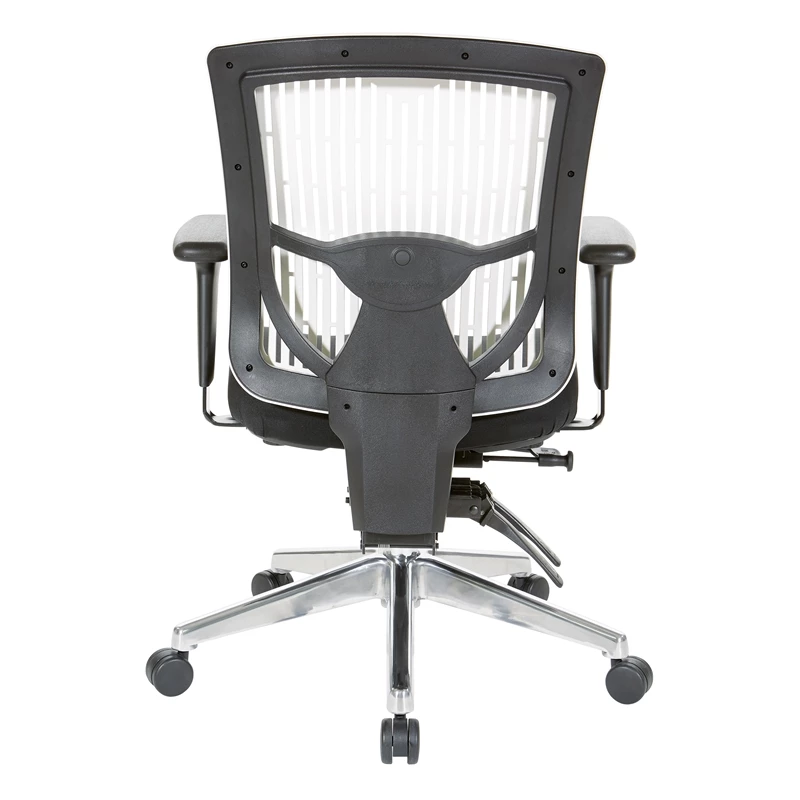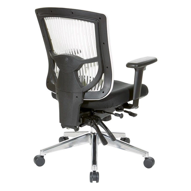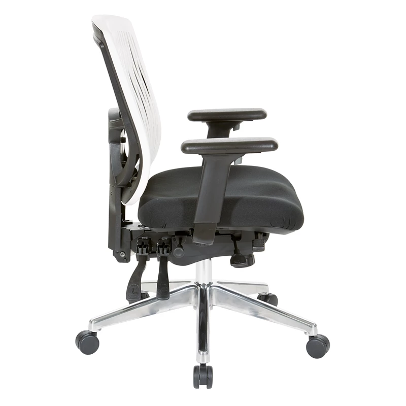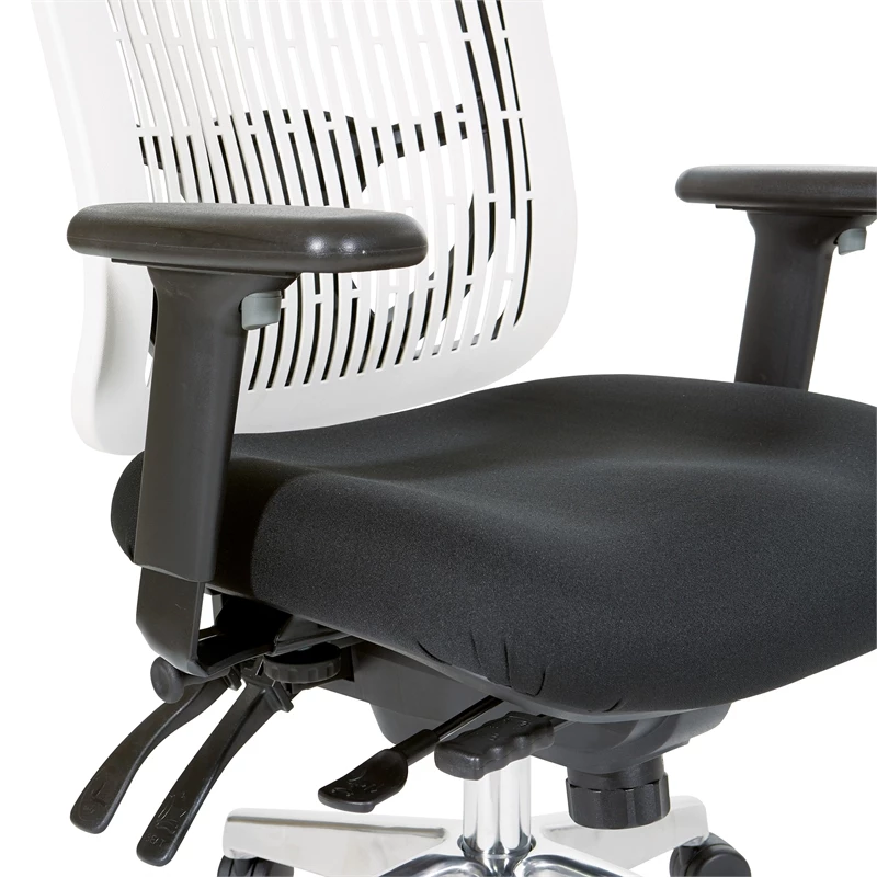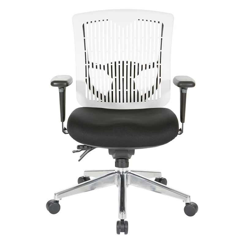 Contoured White Plastic Back Manager’s Chair Work in comfort and style in the new Pro-Line II® Multi-Function Chair. Perfect for workers who spend extended periods of time at their work stations, this intelligently designed chair provides comfort and support to both your body and mind. The contoured plastic back with built-in lumbar support and high-quality foam seat affords for hours of cozy seating, minimizing fatigue and alleviating pressure on the spine. The one-touch pneumatic seating adjustments allow you to elevate to the perfect height while the deluxe Multi-function control with forwarding tilt lets you adjust the seat and back angles to help reduce fatigue in your back and thighs. Complete with height adjustable arms with soft PU pads and a Chrome base with dual wheel carpet casters that provide for effortless mobility across tile and carpet floors alike.