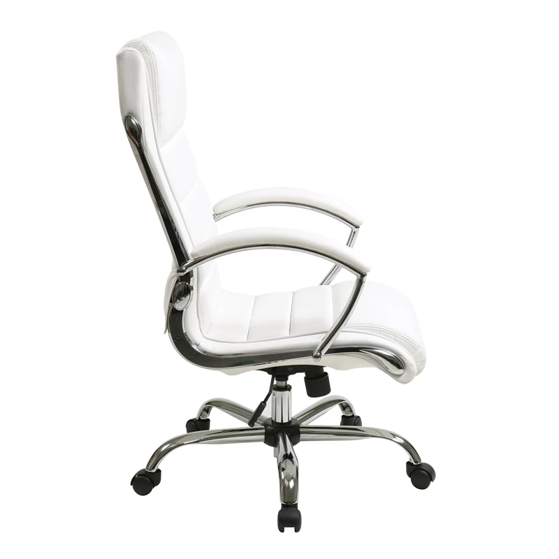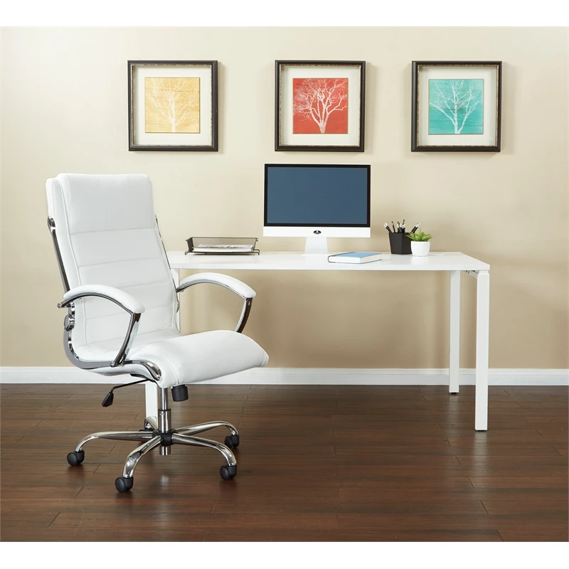 Executive Chair with Thick Padded White Faux Leather Seat and Back with Built-in Lumbar Support The Executive Chair’s alluring sleek design inspires your creative side without sacrificing ultimate productivity. Indulge in the comforts of the cushioned headrest, contoured lumbar support, and a smooth tilting mechanism. With incredibly soft faux leather in either Black, Red, White, or Cream complemented with chrome accents, the perfect companion to any workday.