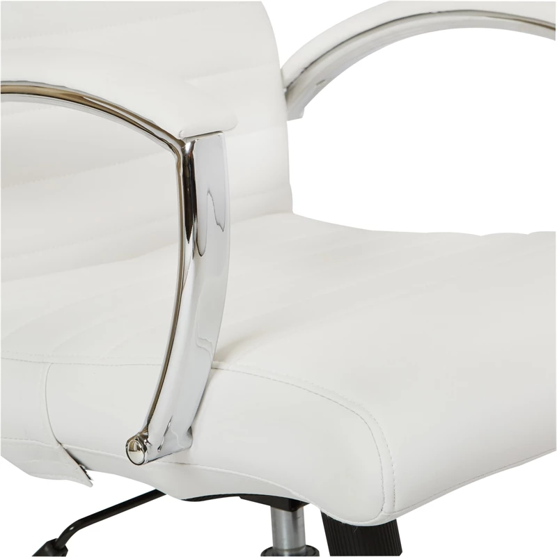 Executive Low Back Chair in White Faux Leather with Chrome Arms and Base K/D Lavish up your daily work routine with the Worksmart Executive Low Back Chair. Decorated in executive faux leather and padded chrome arms, you’ll feel both relaxed and more motivated in the workplace. Show off your professional style with a polished chrome base and dual-wheel carpet casters for accessible mobility. Slick adjustable features and an affordable price make this an intuitive choice for any office.