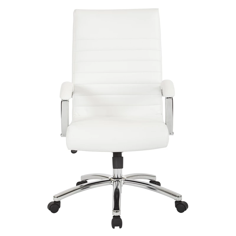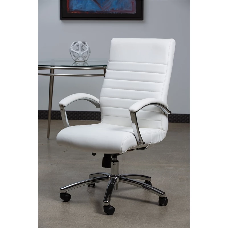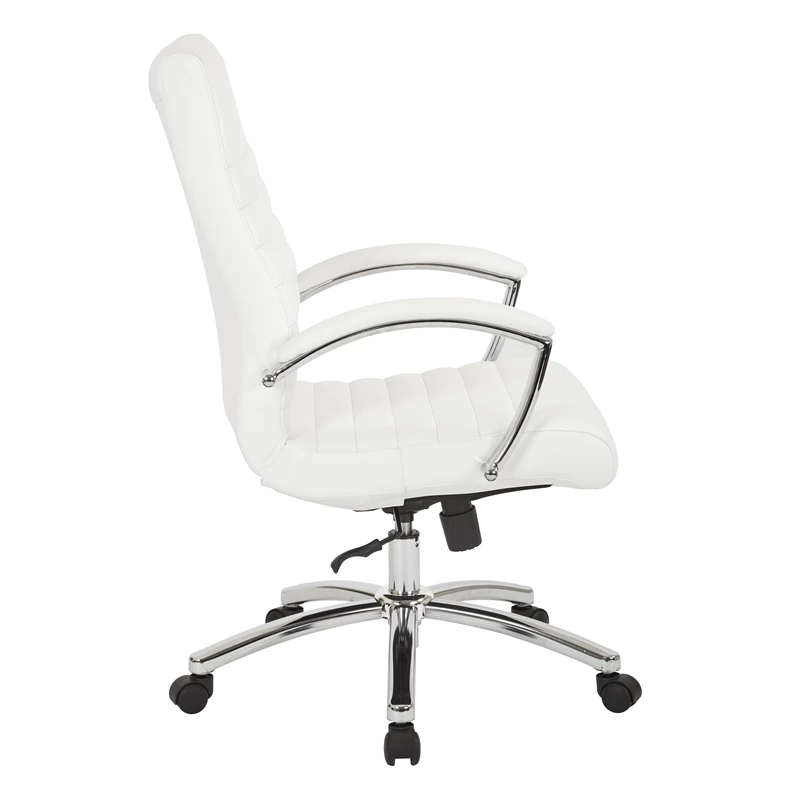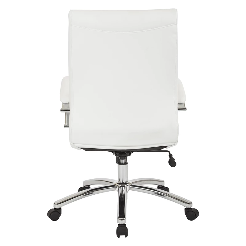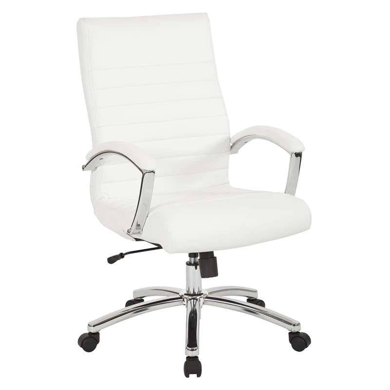 Executive Mid-Back Chair in White Faux Leather with Padded Arms and Chrome Finish Base Joyfully modern. A budget-friendly option in executive seating, this faux leather office chair sets the bar in modern office style. Sit comfortably while you work with the gentle curve of the seatback, featuring built-in lumbar support for added satisfaction. Sleek chrome accents bring a stylish flair, making this a must-have chair for any office space. Update your office seating with the Work Smart Executive Chair.