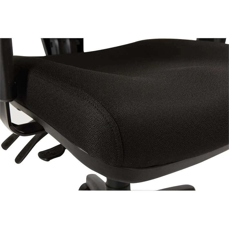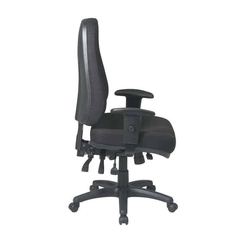 High Back Multi Function Ergonomic Chair in Black Fabric The high back ergonomic chair is the attractive, sophisticated seating solution your office has been missing. Sit in luxury against a padded height-adjustable back with built-in lumbar support, while taking full advantage of a seat with pneumatic height adjustment, multi-function control, and adjustable tilt tension. Supremely comfortable height and width-adjustable padded arms finish a chair with a heavy-duty nylon base and dual wheel carpet casters. It’s a seat that absolutely means business as a welcome addition to those who seek modern comfort and timeless style.