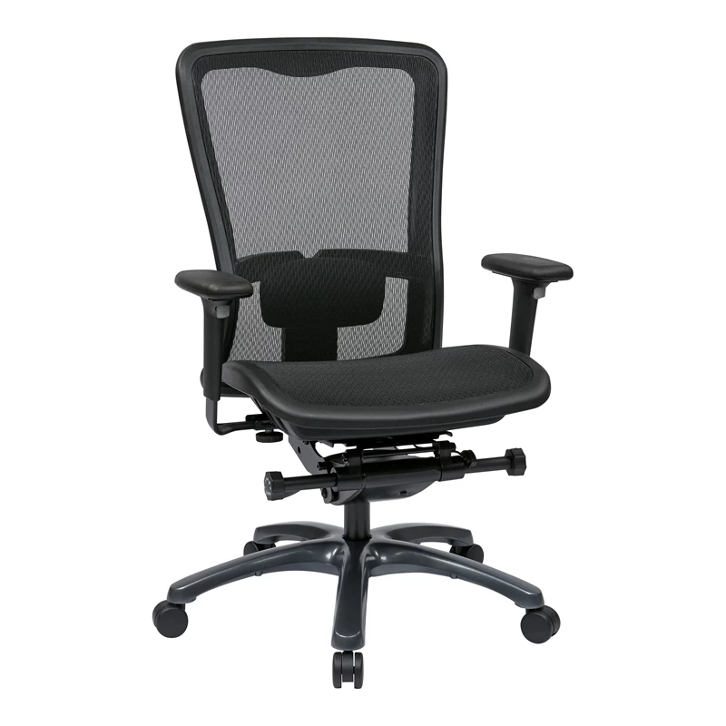 Office Star ProGrid High Back Office Chair in Black Fabric Advanced design coupled with superior construction beam from this Breathable High Back Ergonomic Office Chair. Featuring a high-quality padded seat designed to foster spine health, and one touch pressured seat height adjustment for ease-of-use, comfort and support are now within reach. A durable mesh back provides for breathable lumbar support, while the adjustable padded armrests allow you to relax your arms at your desired heigh thus minimizing fatigue and promoting productivity. Synchro controlled seat sliders further elevate your comfort level when used in conjuction with the standard adjustable tilt tension. A durable titanium finished base provides for a modern look that doubles as a sturdy long-life coating atop the durable dual wheel carpet casters. Combine all these features with the black synthetic fabric and you have a stylish seating option that is designed to support your body and mind. Add to cart now for online savings on this durable office chair.