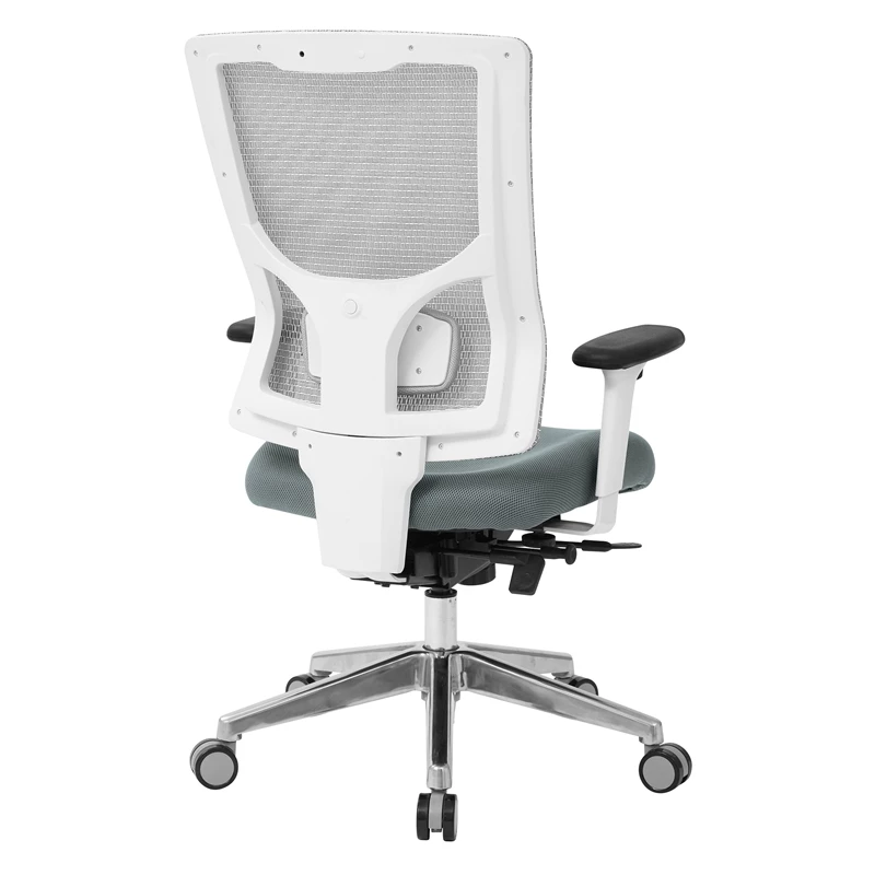 ProGrid® White Mesh Mid Back Chair with Gray Fabric Mesh Seat Work in comfort and style in the new ProGrid® High-Back Chair. Perfect for workers who spend extended periods of time at their workstations, this intelligently designed chair provides comfort and support to both your body and mind. The amazingly strong yet lightweight breathable ProGrid® white mesh back conforms to your body’s unique contours with added adjustable lumbar support, and high-quality fabric with molded foam affords for hours of cozy seating, minimizing fatigue and alleviating pressure on the spine. Designed to fit all shapes and sizes, the seat conforms to your body’s movements while the Ratchet back and one-touch pneumatic seating adjustments allow you to elevate to the perfect height. The Deluxe 3-position Locking 2-to-1 synchro Tilt control with seat slider will let you recline with comfort and ease. Complete with 2-way adjustable arms with soft PU pads and a durable heavy-duty aluminum base with dual wheel carpet casters that provide for effortless mobility across tile and carpet floors alike. With advanced design and quality construction, this seating option is no doubt an office favorite.