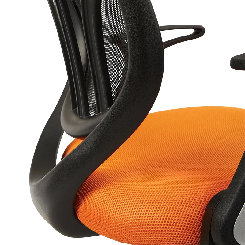 Screen Back Chair with Orange Mesh Flip Arms and Silver Accents The Screen Back Task Chair features a modern two-tone design and built-in lumbar support. Our task chair is made of a breathable mesh material that allows air to circulate and keep you cool. Fully adjustable height and tilt tension make the seat customizable for any personalized ergonomic preferences. The fabric mesh seat and flip arms are available in four exciting colors.