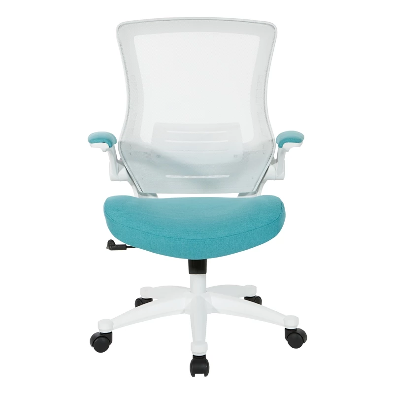 White Screen Back Manager’s Chair in White Turquoise Fabric Everyone needs a smart, stylish chair to support them throughout the day and the Screen Back Manager’s Chair by Work Smart® with faux leather seat and padded flip arms with silver accents is sure to please. This high-style look includes a supple, padded faux leather seat and adjustable padded flip arms for hours of plush comfort. A breathable screen back with built-in lumbar support gives this chair its modern attitude while keeping you cool throughout the day. One-touch pneumatic seat height adjustment, locking tilt control and adjustable tilt tension ensure you’re comfortable and in an ergonomic position for maximum productivity. This manager’s chair also features an attractive ultra-modern white base with dual-wheel carpet casters that ensure effortless mobility.