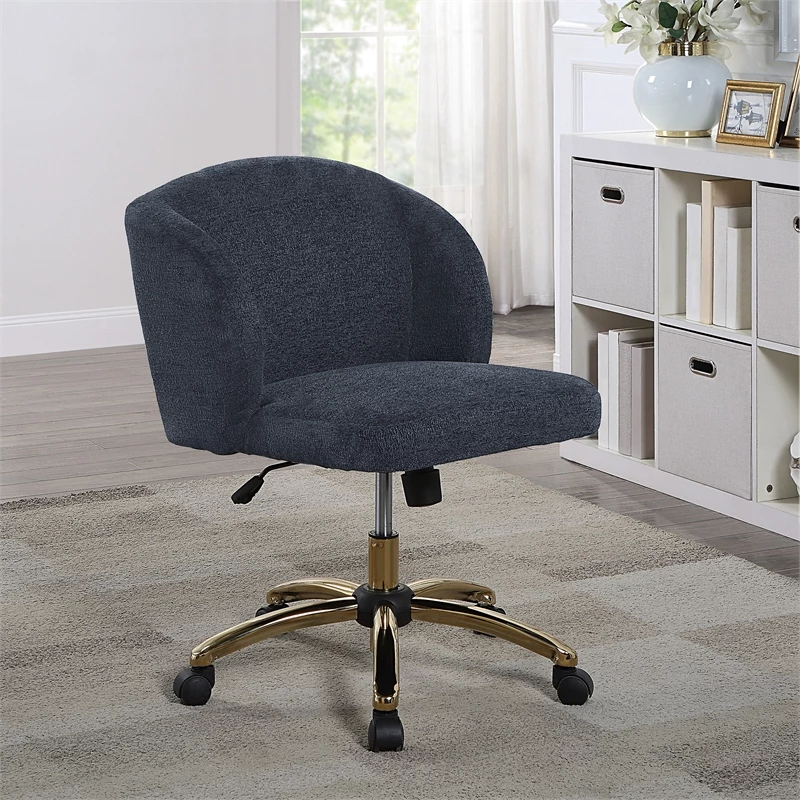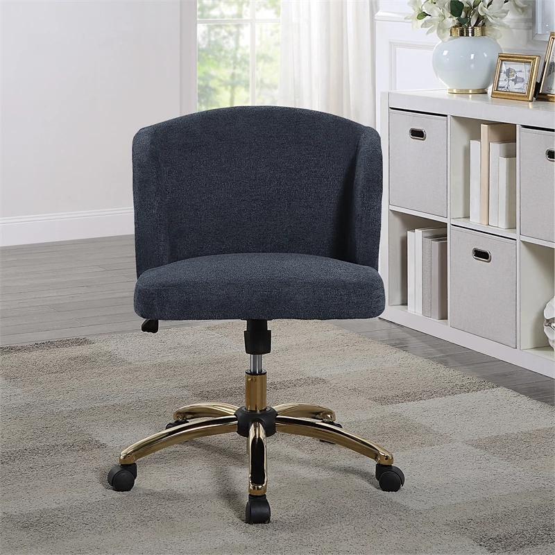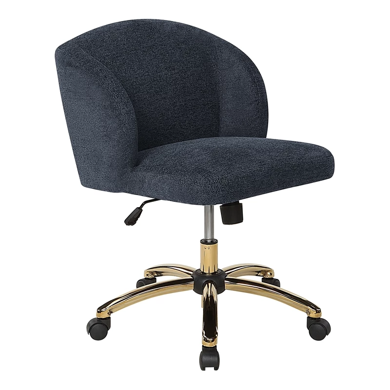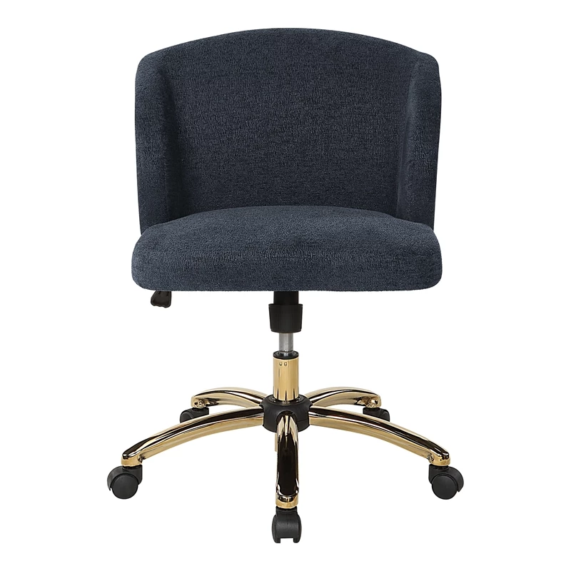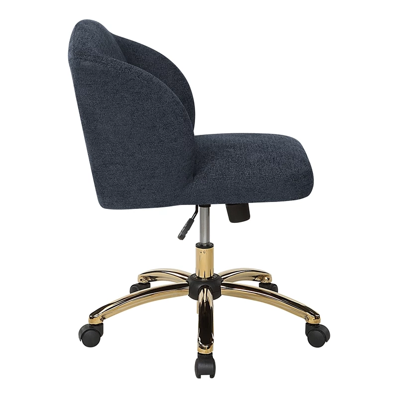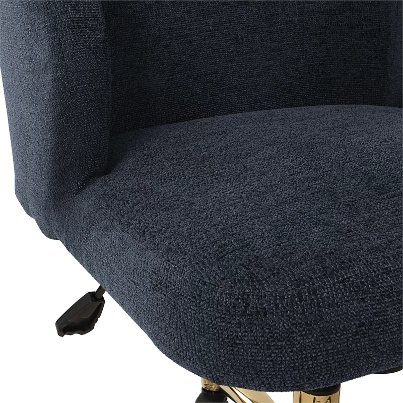 Ellen Office Chair in Indigo Blue Fabric with Gold Base Express your style and elevate your comfort level with the perfect office chair for the modern home office. Featuring height adjustability, adjustable tilt tension and smooth dual wheel caster movement. The sophisticated style of a chic office chair will provide the ideal seating solution. Trendy colors and contemporary chrome 5-star base will instantly make over your home office to a workspace