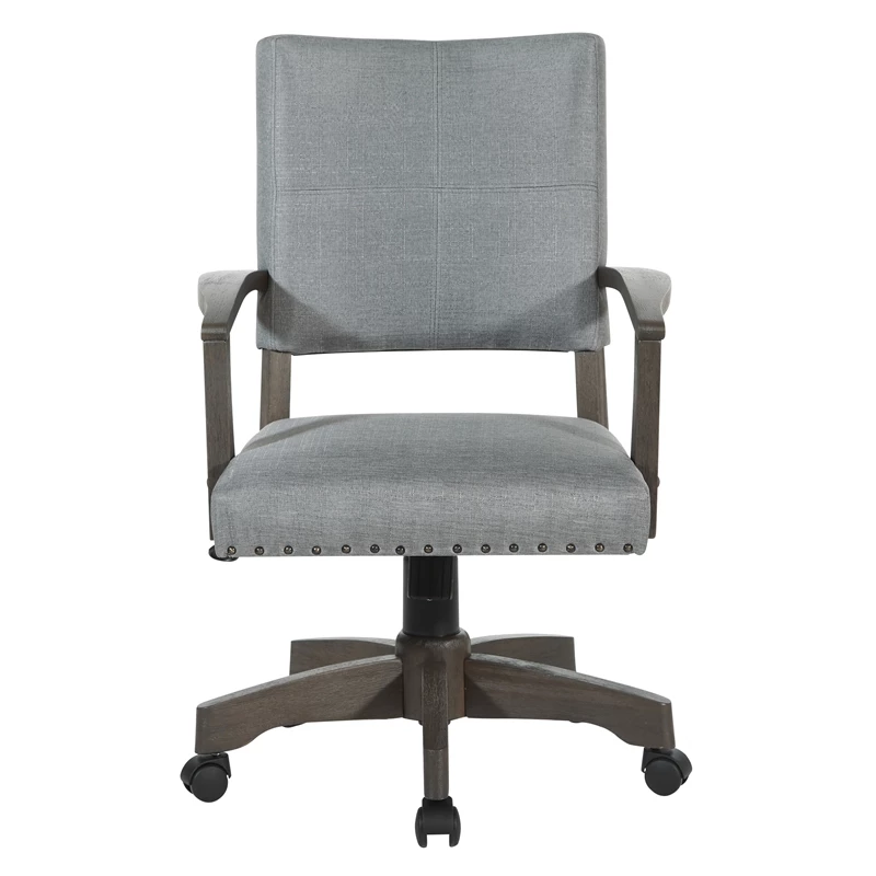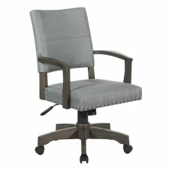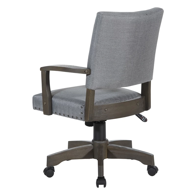 Santina Bankers Chair with Antique Gray Finish and Gray Fabric Add classic elegance to your home office with our deluxe upholstered Banker’s Chair. Nailhead trim, solid wood armrests and cushioned back with attractive double stitch French seam adds tailored details. Firm, yet yielding foam seat reduces pressure on large muscle groups. Adjustable height brings you to exactly the correct level and tilt tension will keep the recline just where you prefer. Our durable 5-star base and contemporary color will add a striking traditional feel to any home office or workspace.