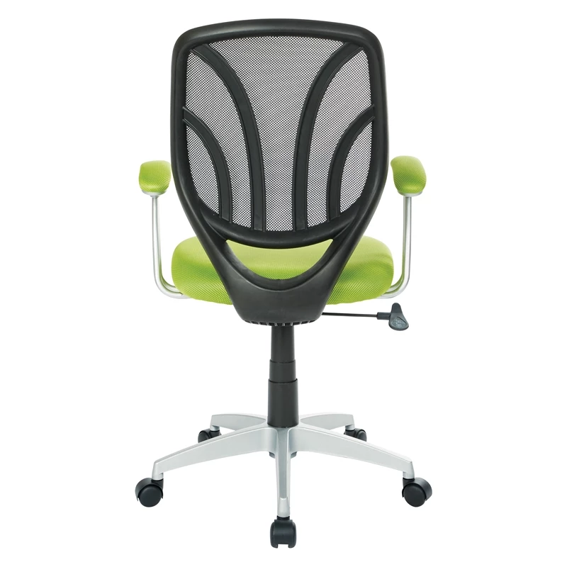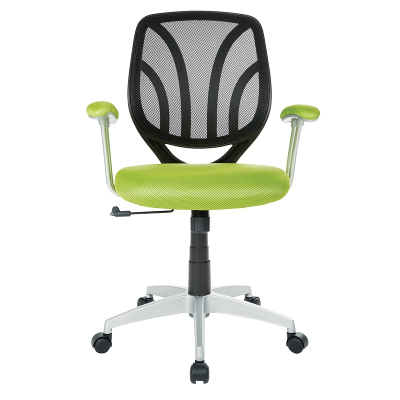 Screen Back Chair with Green Mesh Fabric and Silver Coated Arms and Base The Screen Back Task Chair features a modern two-tone design and built-in lumbar support. Our task chair is made of a breathable mesh material that allows air to circulate and keep you cool. Fully adjustable height and tilt tension make the seat customizable for any personalized ergonomic preferences. The fabric mesh seat and armrests are available in five exciting colors.