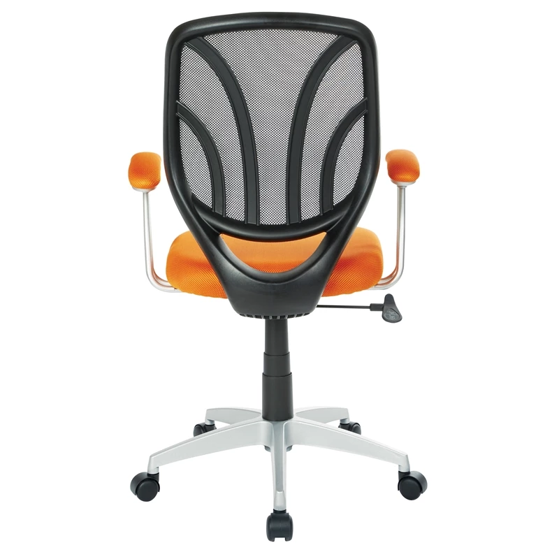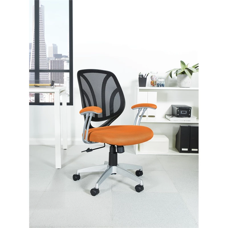 Screen Back Chair with Orange Mesh Fabric and Silver Coated Arms and Base The Screen Back Task Chair features a modern two-tone design and built-in lumbar support. Our task chair is made of a breathable mesh material that allows air to circulate and keep you cool. Fully adjustable height and tilt tension make the seat customizable for any personalized ergonomic preferences. The fabric mesh seat and armrests are available in five exciting colors.