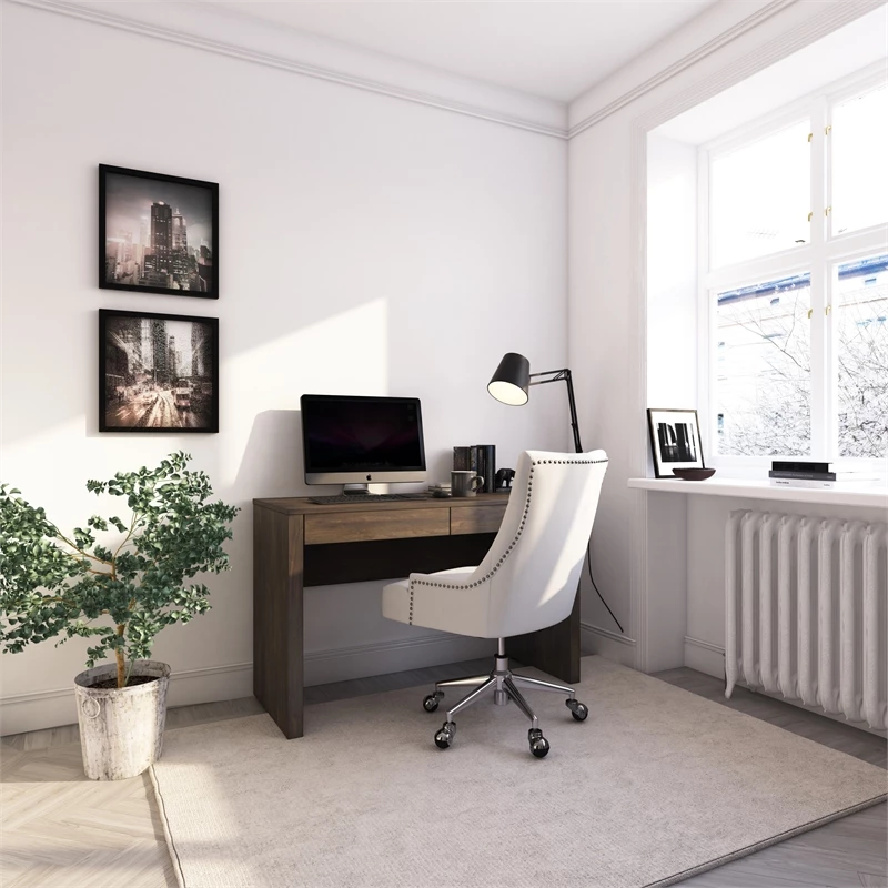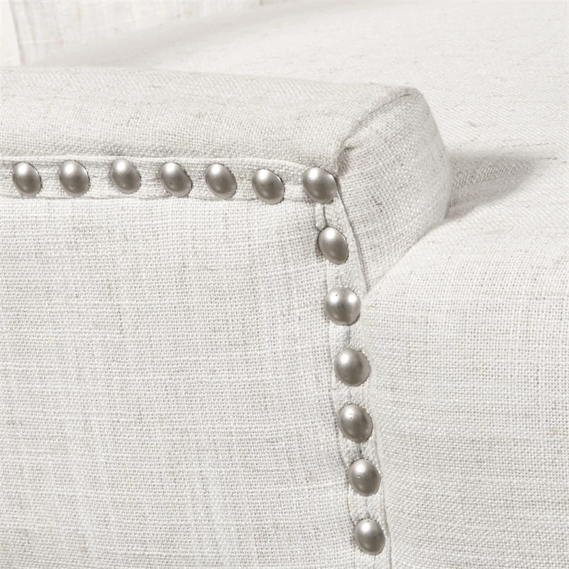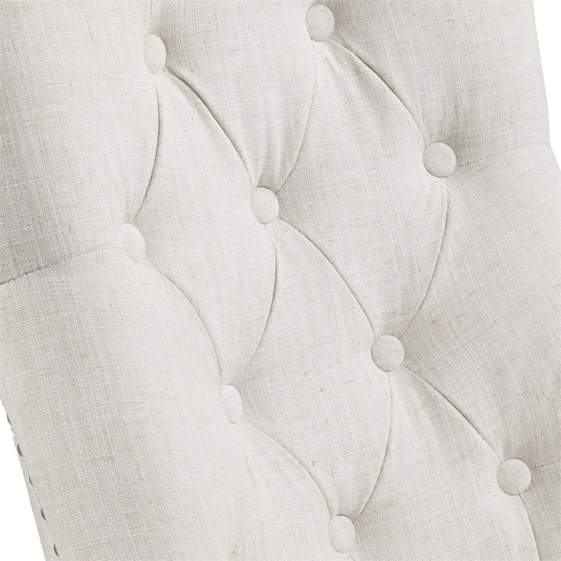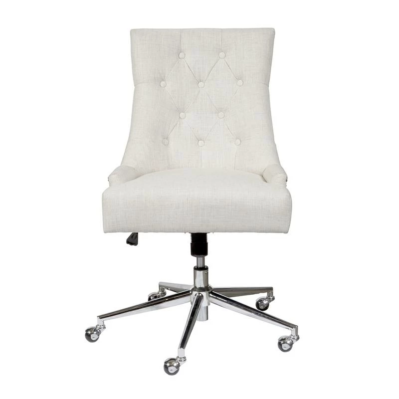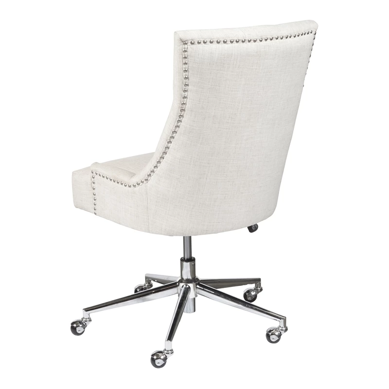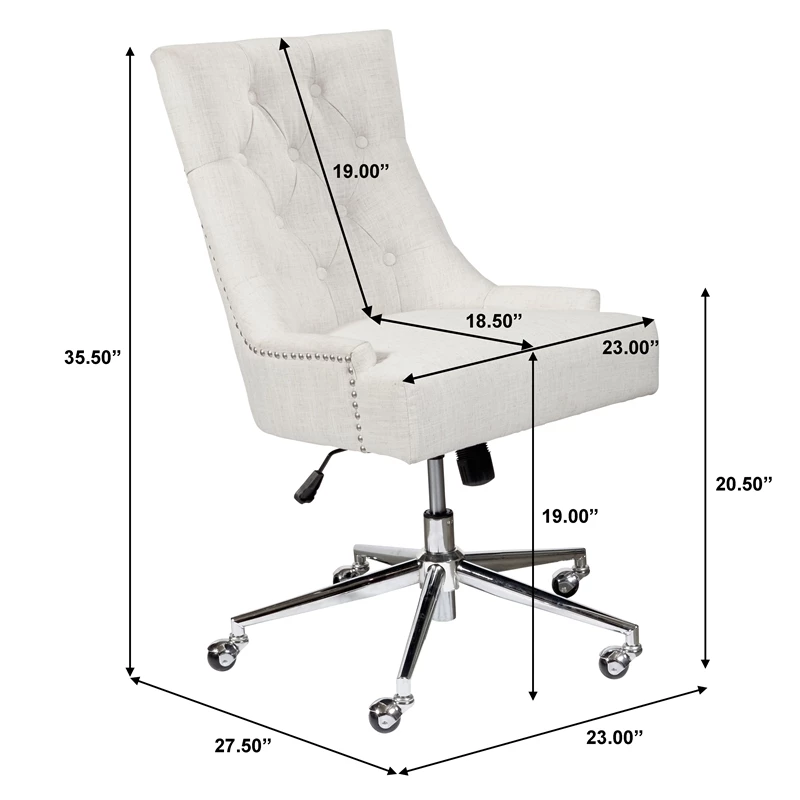 Gliding smoothly on a five-wheeled metal base, this attractive office chair is a refreshing upgrade from utilitarian styles. The tufted back and nailhead trim add a chic feminine element, supported with plush foam underneath for an indulgent feel. A lever-style handle under the seat allows seat height adjustment between 19 and 22.5 inches for a custom profile, ensuring this chair is always a perfect fit for your desk. Woven polyester fabric offers a linen-like look and feel, with a beige finish that blends in easily with a variety of neutral color palettes.
