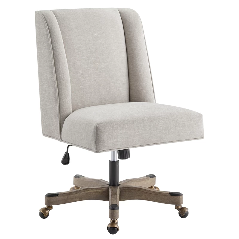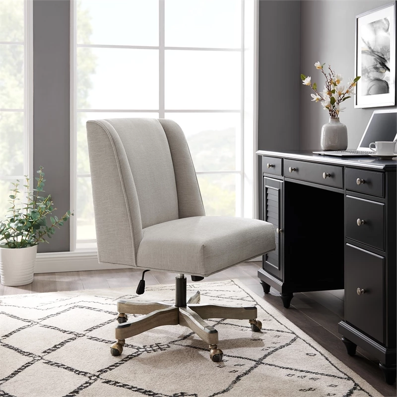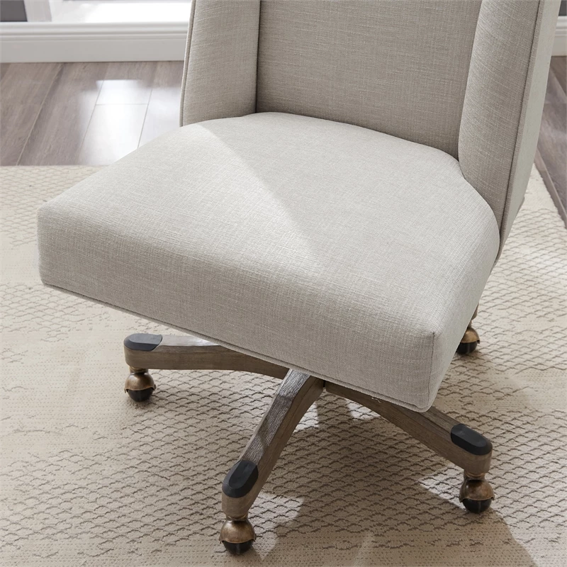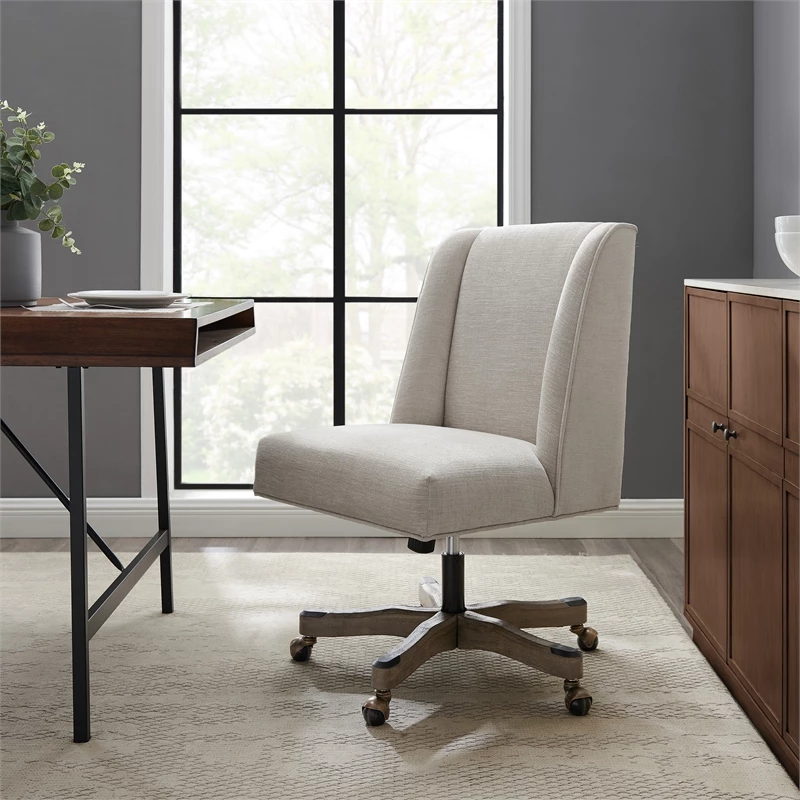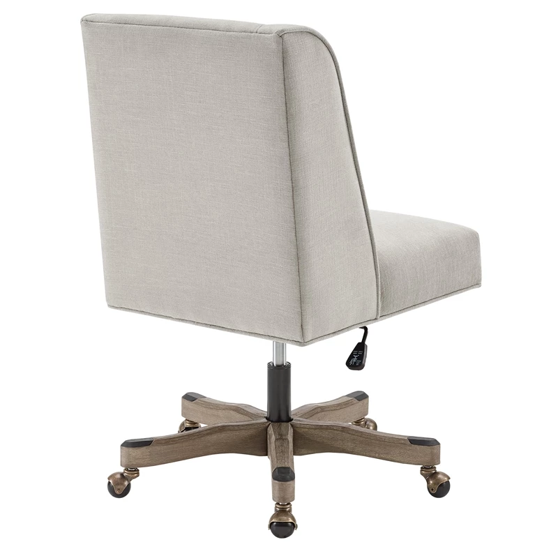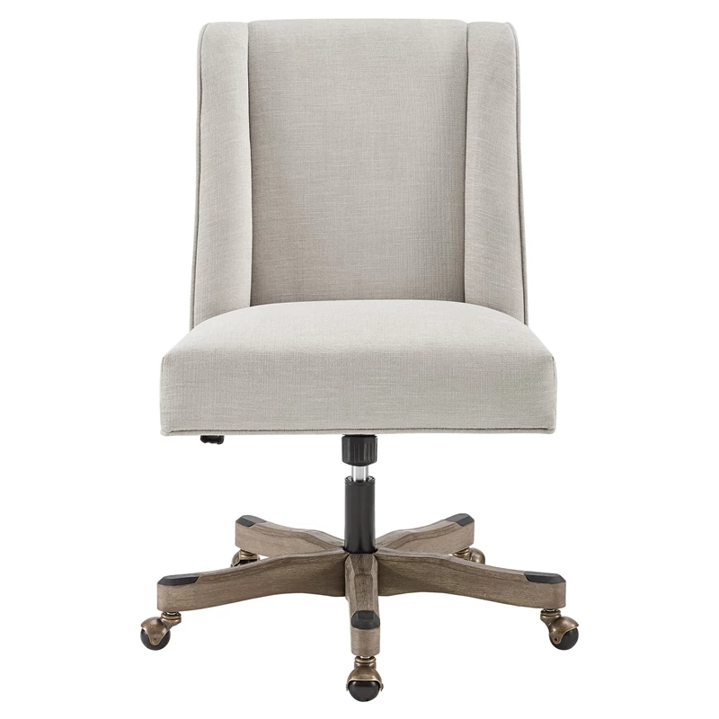 Add style and function to your office or dining with the Office Chair. The soft, plush frame features simple, modern lines upholstered in a natural linen finish fabric with tailored welting. A sturdy gray wash wood base is set upon durable metal casters for easy mobility. An adjustable seat height ensures this chair works for a variety of table heights. Perfect for a home workspace or a formal dining area, it is sure to add style and comfortable seating.