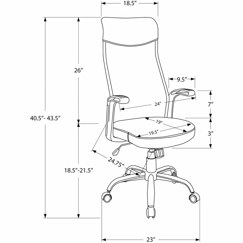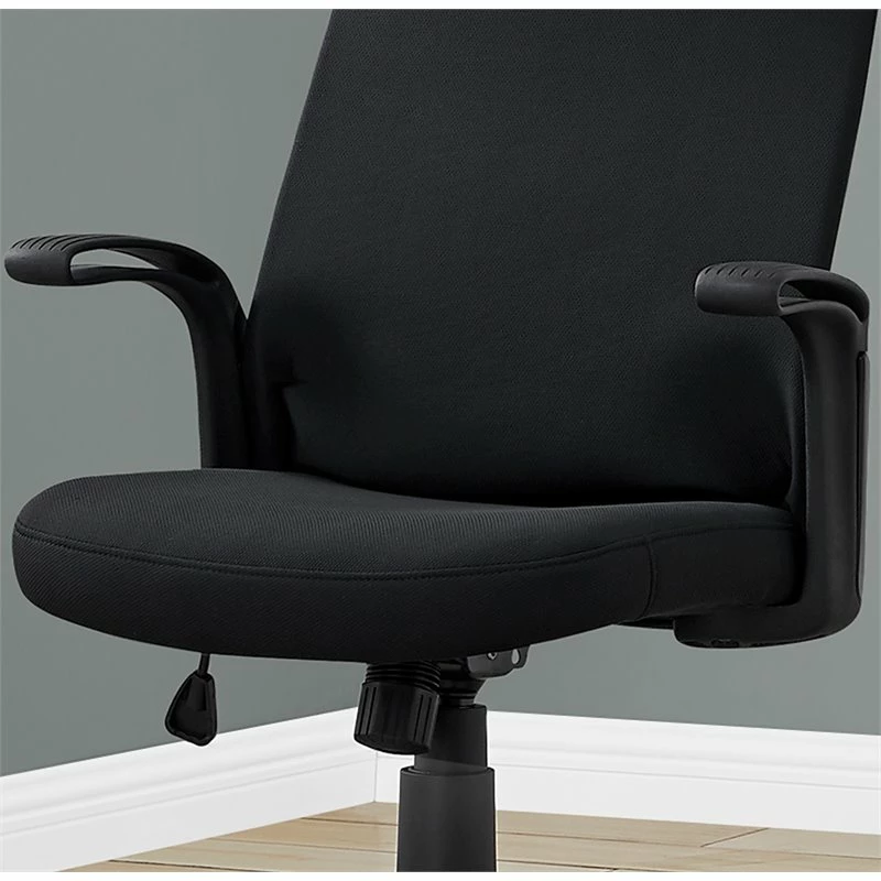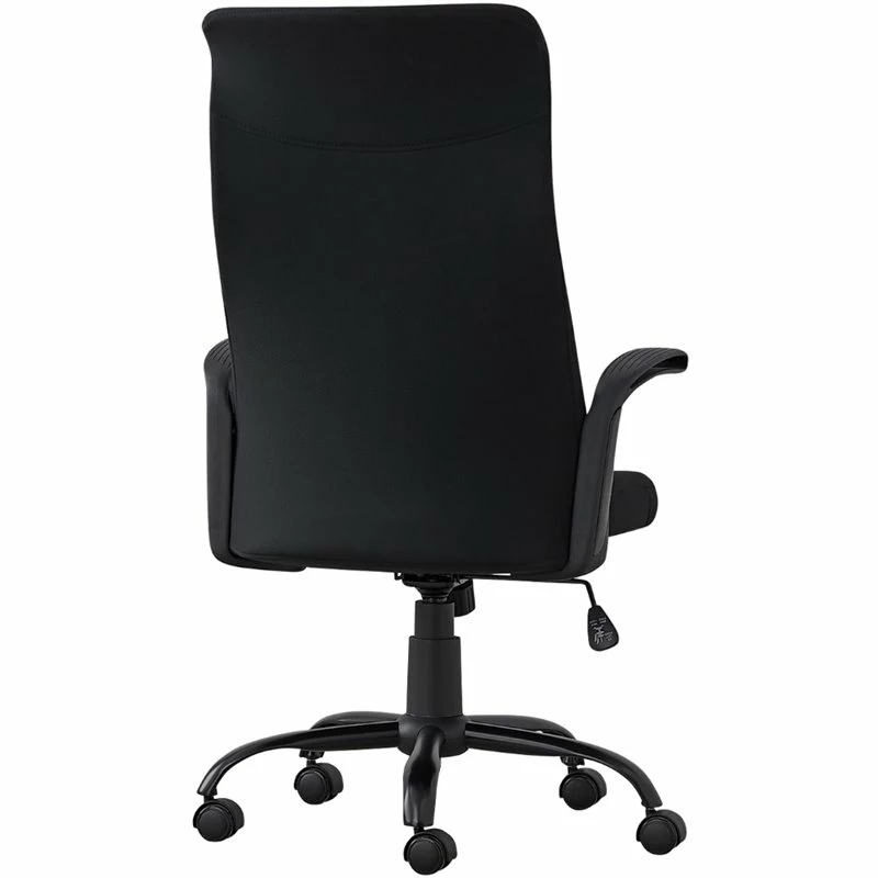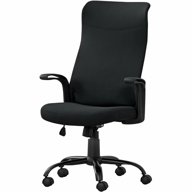 Sleek and contemporary, this black BIFMA certified office chair brings a simple chic look to any office space. Upholstered in a durable and breathable polyester fabric, this multi-position high back office chair, with a 360-degree swivel, has a convenient lever to adjust the seat height with a lock-in/ free tilt mechanism so you can sit back and work in ultimate comfort. The ergonomically designed back rest, thick cushioned seat, and rounded armrests accented with grooved lines, all support long hours of sitting. The chair has a solid 5-star black base over 5 hooded nylon castors for a smooth movement. Assembly is required.