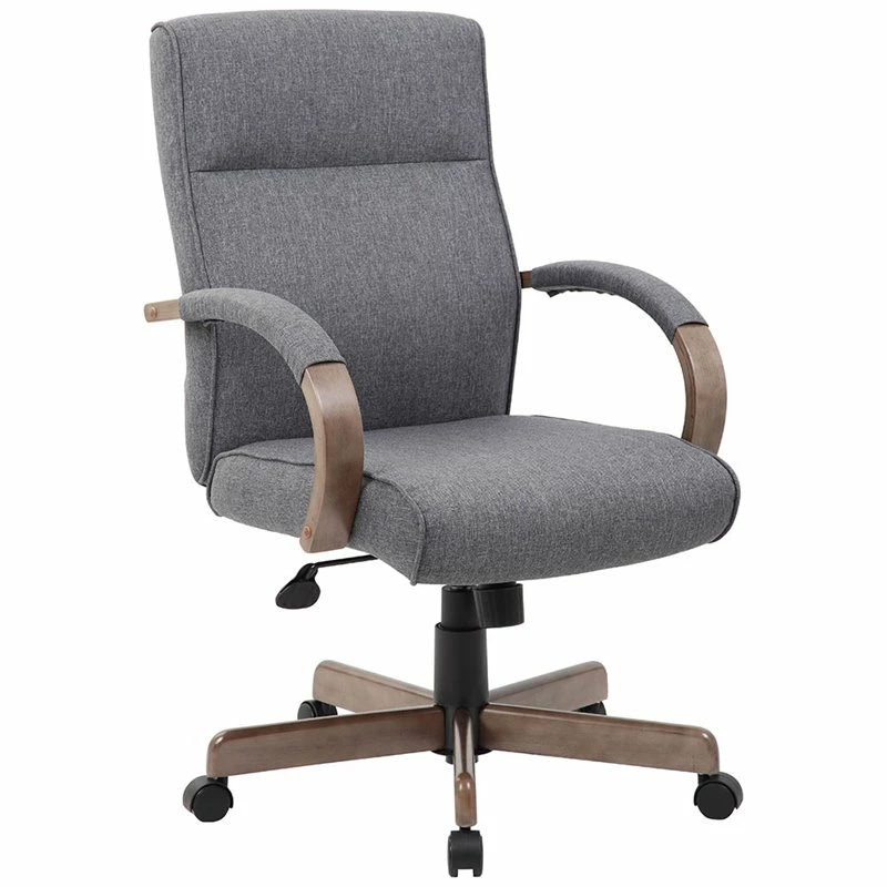 The Scranton & Co executive chair showcases an arched silhouette, slate gray linen upholstery and a driftwood finished base with padded arm rests. Aesthetically pleasing as well as ergonomically functional the modern executive conference chair features a spring tilt mechanism with upright locking position and pneumatic gas lift seat height adjustment as well as adjustable tilt tension control. The hooded double wheel casters roll smoothly for effortless movement resulting in ultimate comfort and style to complement any decor.