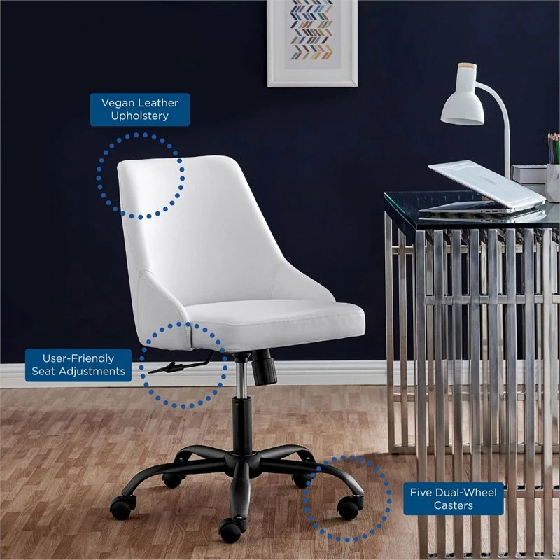 Bring modern style and sleek elegance to the home office with the Designate Vegan Leather Office Chair. Featuring clean lines and a tailored profile, this desk chair is padded in dense foam and upholstered in smooth vegan leather offering a supportive, comfortable place to sit during the workday. A black powder-coated base and five dual-wheeled nylon casters provide easy movement over hardwood or carpeted surfaces while the full 360-degree swivel, tilt tension control, and pneumatic height adjustment create a custom seating experience. Perfect for the modern home or office, this office chair is a desirable addition to any workspace. Chair Weight Capacity: 220 lbs.