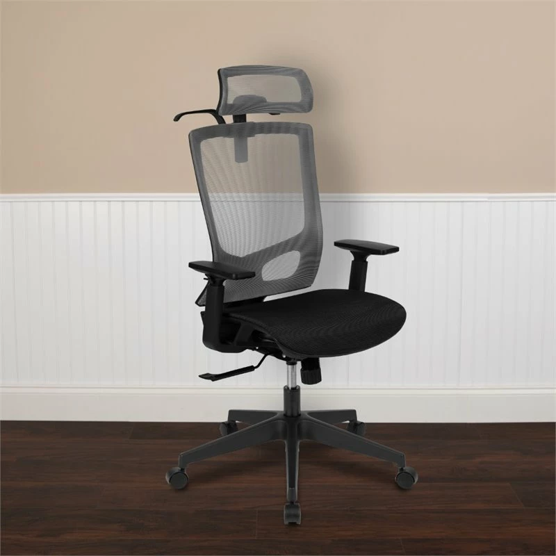Improve your work productivity with a high back two-tone mesh office chair offering comfort and character to your office space. A fully transparent mesh office chair circulates air to both your back and underside. The ventilated mesh material provides adequate airflow that you never knew you desired until you’ve sat in a mesh chair. Falling articles are reduced with a coat hanger hook for convenient retrieval. Don’t let work stress you out or be uncomfortable while doing so when you have an ergonomic office chair on your side. The ratchet height adjustable headrest also includes a full pivot range of motion to customize to your desired positioning. What makes this office chair unique and ergonomic is the synchro-tilt where the back and seat recline at a 2-to-1 ratio respectively, keeping the seat closer to the floor as you recline. Having your feet remain level on the floor while reclining puts you in a more relaxed position. The chair locks in 3 positions to lock in your reclined and working positions, adjust the rocking motion by turning the knob underneath the seat. Backed by generous lumbar support and a waterfall edge that relieves pressure from the backs of your legs, this mesh back swivel ergonomic task office chair will exceed your needs. With functions to get you through any task you’ll enjoy this chair as your home office chair or professional office chair.