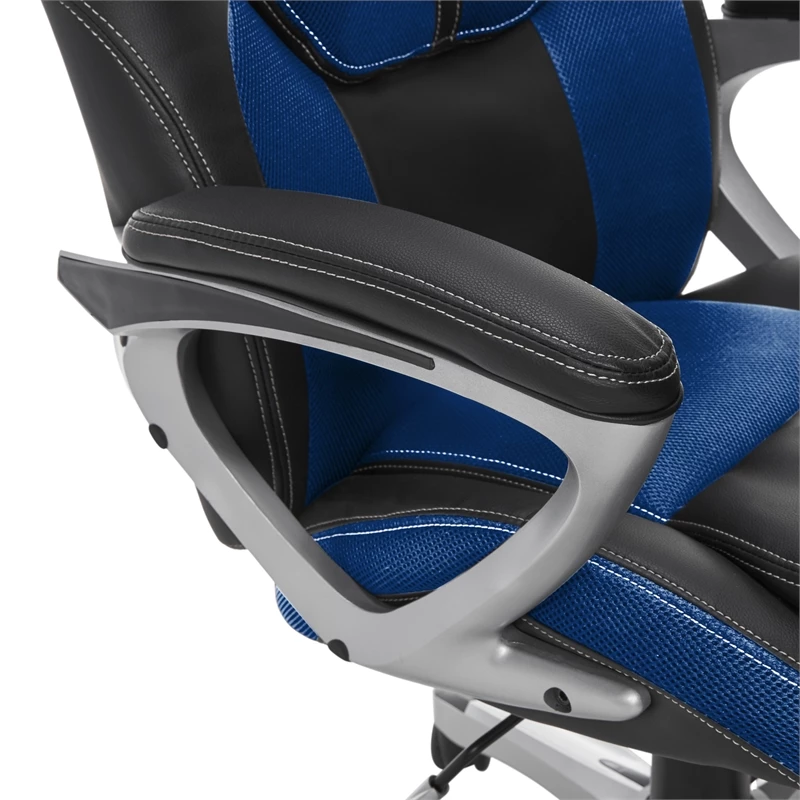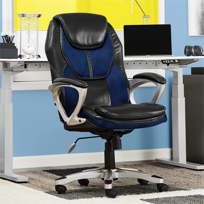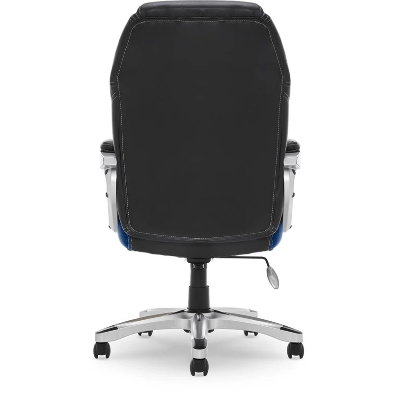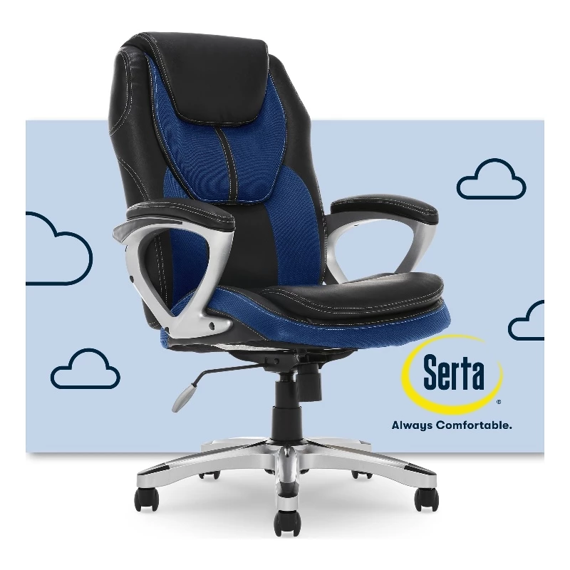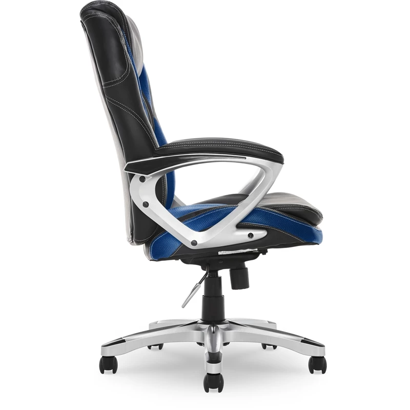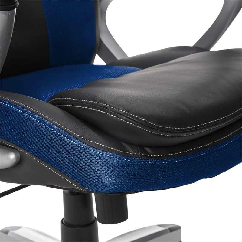 Made with gamers and programmers in mind, this Serta Amplify Executive Office Chair Blue delivers deluxe features with a stylish, modern look. This black leather office chair features a specially designed ergonomic seat and a contoured lumbar to provide customized support, improve posture, and reduce stress in the back, neck, and shoulders. The pneumatic seat height adjuster works with a simple weight shift, making it easy to find the right fit for you, while the rolling casters offer smooth portability and movement. Made with faux leather upholstery and breathable mesh accents, this office chair sports a sleek, race-car-inspired design. Whether you’re working on a presentation at the office or booting up a game at home, the Serta ergonomic office chair will make you feel like you’re sliding into the driver’s seat of a high-performance race car.