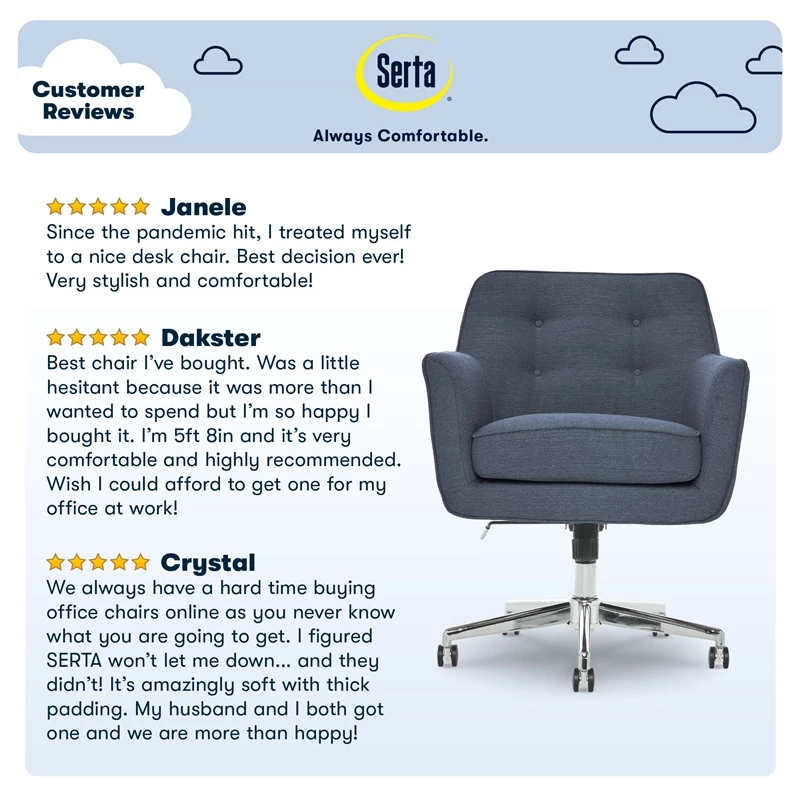 The all-American office chair just got an upgrade! Meet the Serta Ashland Ergonomic Home Office Chair with Memory Foam Cushioning. From the chrome-finish base to the memory foam cushions, this beauty is destined to become a classic in your office or home office. Customize your workspace with durable rolling casters that smoothly glide from task to task. With strong, elegant lines and soft upholstered fabric, the Ashland Home Office Chair from Serta can get you through the workweek with style and comfort!