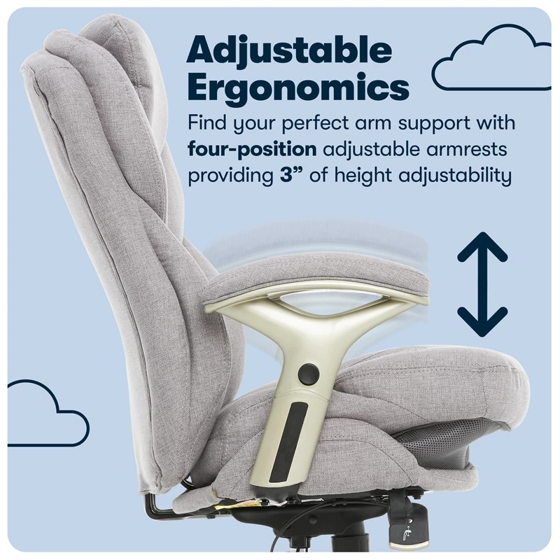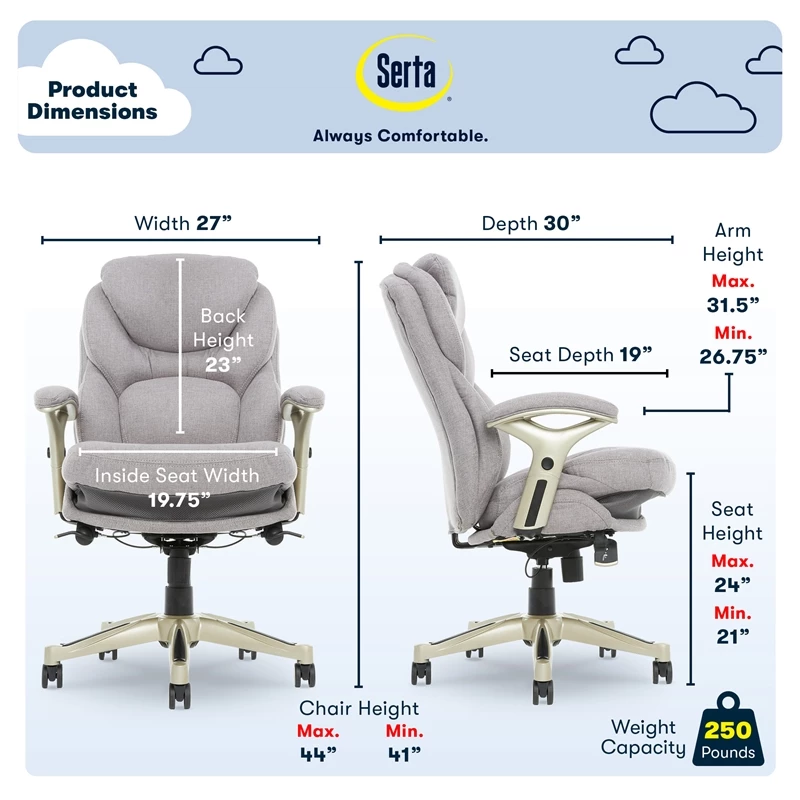 Help promote strength and flexibility in your back while you work with the Serta Works Ergonomic Executive Office Chair. This ergonomic office chair helps users become more productive and efficient by maximizing lower back support and comfort while seated. Its unique Back in Motion Active Seat Technology swivels the lumbar forward, providing the same effects as a pelvic tilt exercise by promoting spinal movement and flexibility in your core. Push-button adjustable armrests and pneumatic height adjustment allow the cloth office chair to be quickly and easily customized to find the right fit for you. The multilayered cushions are soft yet supportive, so you’ll feel refreshed even after a long day.