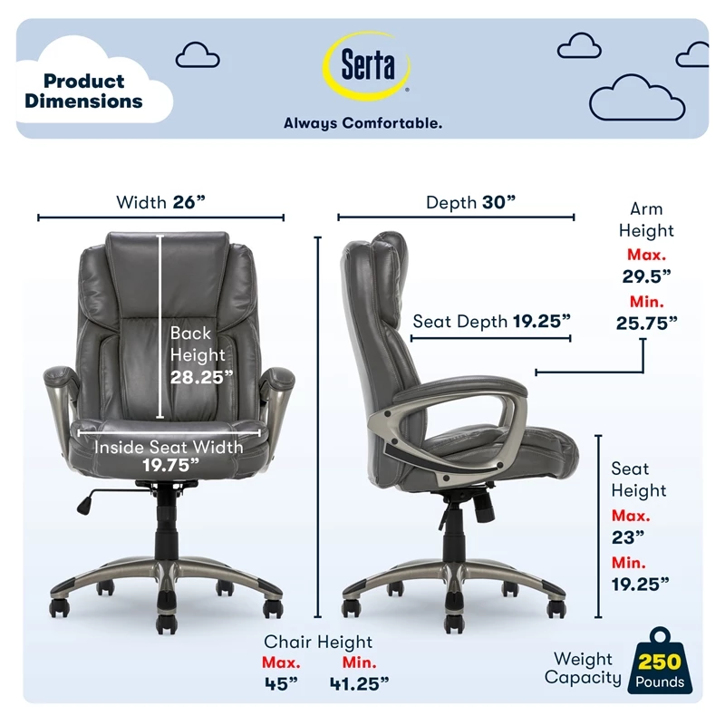 Bring relaxation to your busy workday with the Serta Garret Executive Office Chair. Serta kept comfort in mind while designing this desk chair with luxurious layered body pillows, a contoured lumbar zone, and padded armrests for all day ease and exceptional support during long periods of sitting. The waterfall seat edge reduces pressure on the back of the legs and increases circulation, which helps decrease fatigue while seated. The ergonomic office chair features both recline and seat-height adjustment settings, allowing you to find your optimal seating position. The heavy-duty painted base with scuff-resistant foot pads is designed for long-lasting, reliable use. This desk chair is upholstered in supple bonded leather with contrast stitching. It measures 26-inches wide by 30-inches deep by 44-1/2-inches high and comes with a one-year limited warranty.