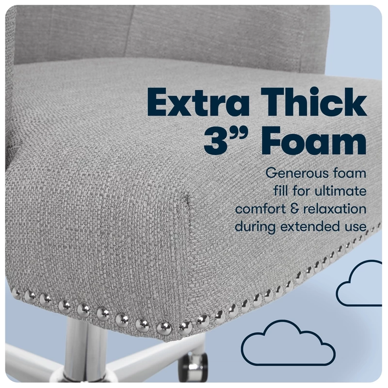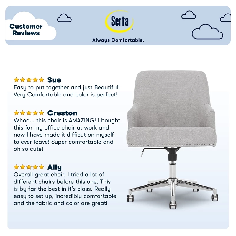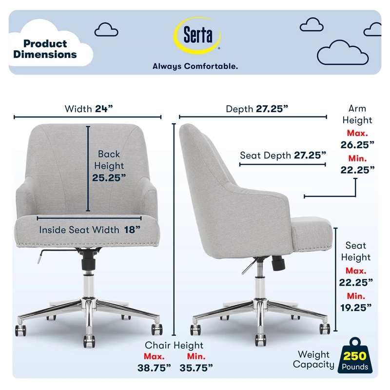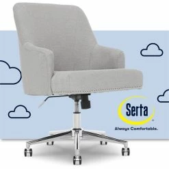 The upholstered Serta Leighton Home Office Chair with Memory Foam adds a touch of modern elegance to any workspace. Expertly wrapped in tasteful neutral fabric with chrome accents around the base, this fabric office chair is an ideal choice for those who want the functionality of a traditional office chair without sacrificing the integrity of their interior design. A memory foam seat with pocket coils delivers renowned Serta comfort while you work, and a height-adjustable frame allows you to tailor the rolling office chair to your professional space. The stainless-steel stand is designed for effortless 360-degree swivel and all-surface casters offer easy mobility, giving you the perfect mix of functionality and style in your home office.