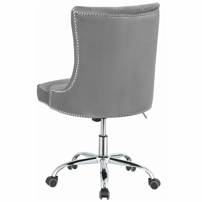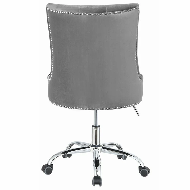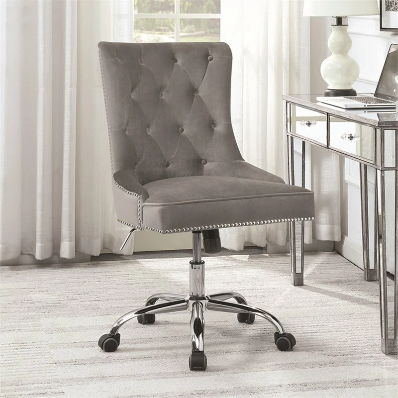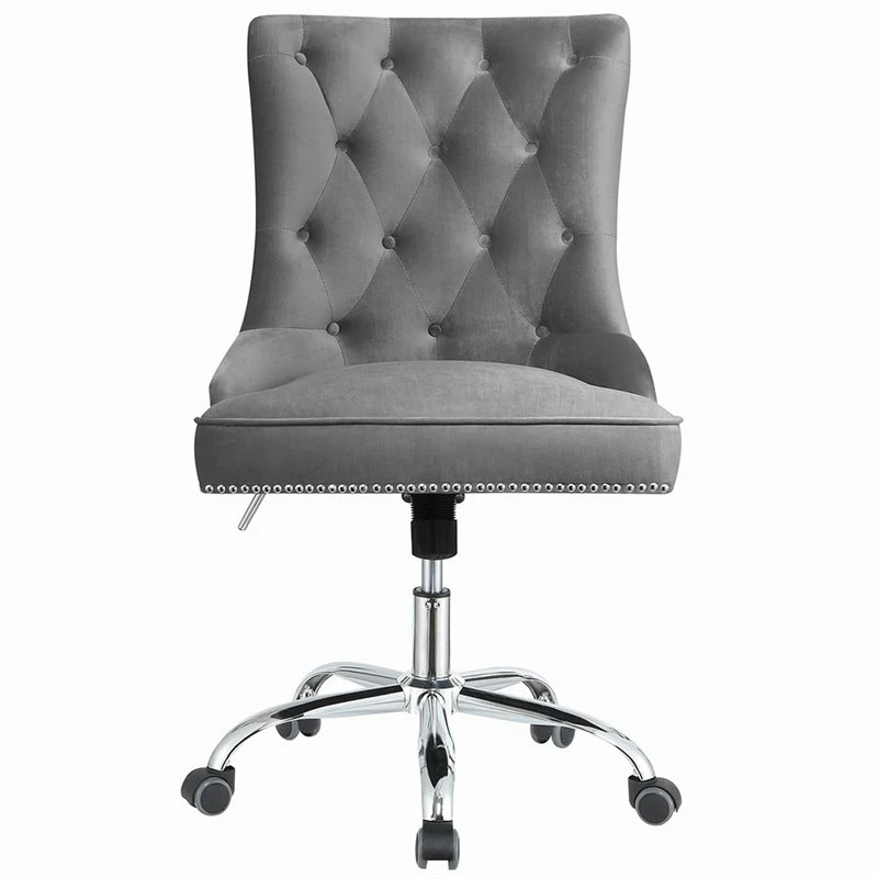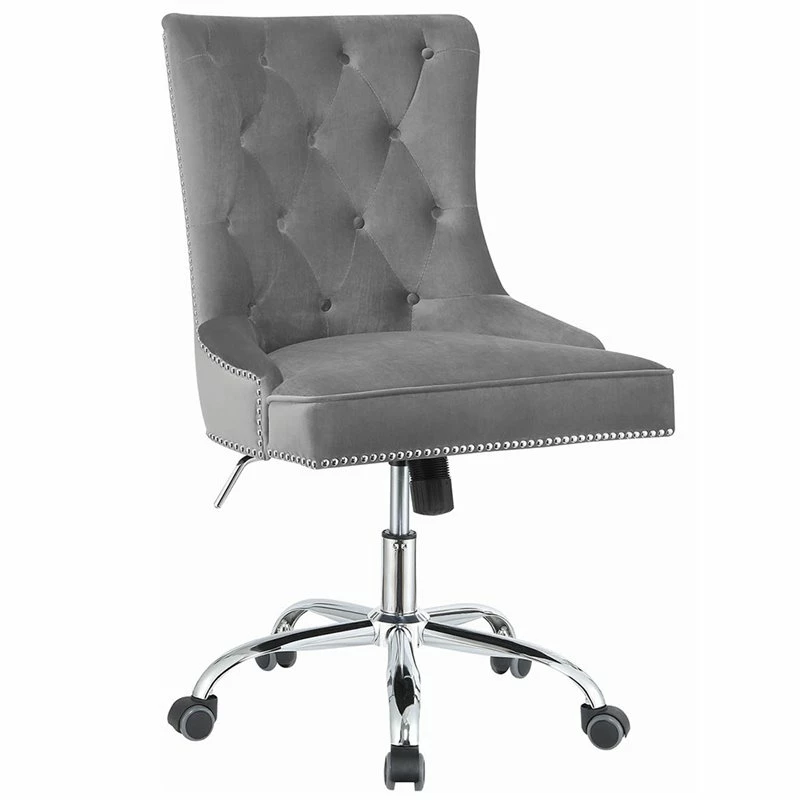 Coaster Allen Velvet Tufted Swivel Adjustable Office Chair in Gray Not your standard office chair, the Allen Velvet Tufted Swivel Adjustable Office Chair exudes traditional elegance combined with modern utility. It is luxuriously upholstered in gray velvet with subtle button-tufted back detail and adorned with silver embellishments around its base. Five built-in casters allow for smooth movement and its sturdy chrome base is fully height adjustable with a convenient hand lever.