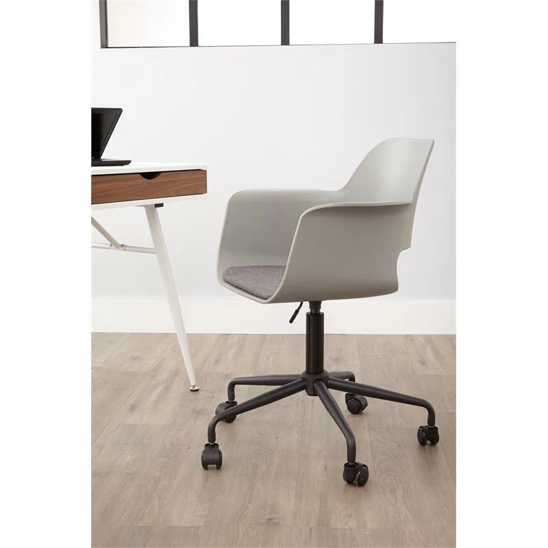 Outfit your office ensemble in contemporary style with this modern office chair. Founded atop four powder-coated metal legs, this piece is crafted with a plastic scoop seat that supports up to 250 lbs. Stain-resistant polyester upholstery provides a bit of cushioning, making it an ideal option for a spill-prone dining space, while felt foot pads below the legs protect your floors from scratches and scuffs.