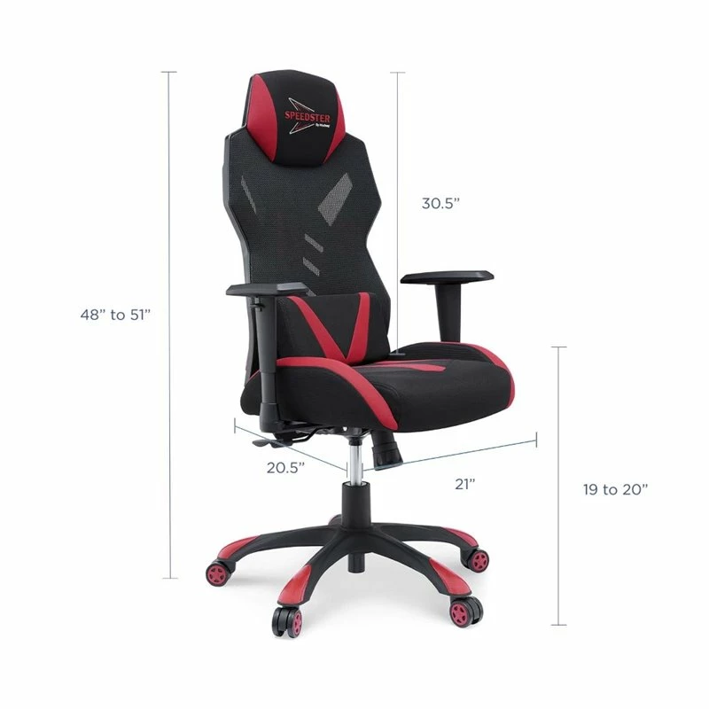 Place the dynamic form of UrbanPro Ergonomic Mesh Gaming Computer Desk Chair in your gaming area for ultimate style and comfort. Make enjoyable the time spent at your desk working and gaming. This versatile gaming chair features height-adjustable armrests and 360-degree swivel rotation on five rolling dual-wheel casters that are responsive to your every need. The ergonomic headrest pillow and lumbar cushion combined with a breathable mesh back present a gaming chair equipped for your long-lasting relaxation. A tilt tension knob and height-adjustable gas-lift function ensure your ideal seat to the degree. UrbanPro Mesh Gaming Chair has a solidly constructed nylon frame base and soft and durable fabric upholstery covering densely padded foam. The bold black and red design of UrbanPro Gaming Chair create an atmosphere of adventure, excitement, and focus on your quests as you explore new virtual worlds.