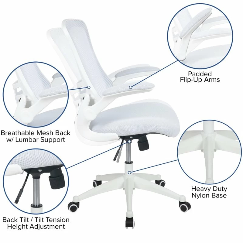 Break free from the norm of conventional office seating with this ultra-modern white frame office chair. The mesh back swivel ergonomic task office chair will exceed your needs in comfort and style. Beat those hot summer days with the ventilated mesh back behind you, offering up huge airflow. The curved backrest has lower lumbar support to provide you with good posture support. This well-built ergonomic office chair has flip-up arms that provide relief to your shoulders and neck but is also great for users who prefer an armless design. The arms flip out of your way when you want to roll your chair underneath the desk and not have to adjust the seat height. Adjusting the seat height is easy with the pneumatic lever. Turn the tilt tension adjustment knob underneath the seat to increase or decrease the amount of force needed to rock or recline. Whether meeting deadlines, chatting with colleagues, answering phones or perusing the internet this contemporary swivel office chair will meet your needs in your professional workspace or in your home office.