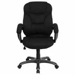 This gracefully designed chair features black microfiber upholstery to comfortably get you through your work day or to keep you comfortable while browsing the internet. This chair features an ergonomically contoured back and seat and arms that are comfortably padded. High back office chairs extend to the upper back for greater support and relieve tension in the lower back, preventing long term strain. The contoured seat dissipates pressure points for greater comfort. The waterfall front seat edge removes pressure from the lower legs and improves circulation. The tilt lock mechanism rocks/tilts the chair and locks in an upright position while the tilt tension adjustment knob adjusts the chair’s backward tilt resistance. Chair easily swivels 360 degrees to get the maximum use of your workspace without strain. The pneumatic adjustment lever will allow you to easily adjust the seat to your desired height. The titanium nylon base with black caps prevents feet from slipping when resting on chairs base.
