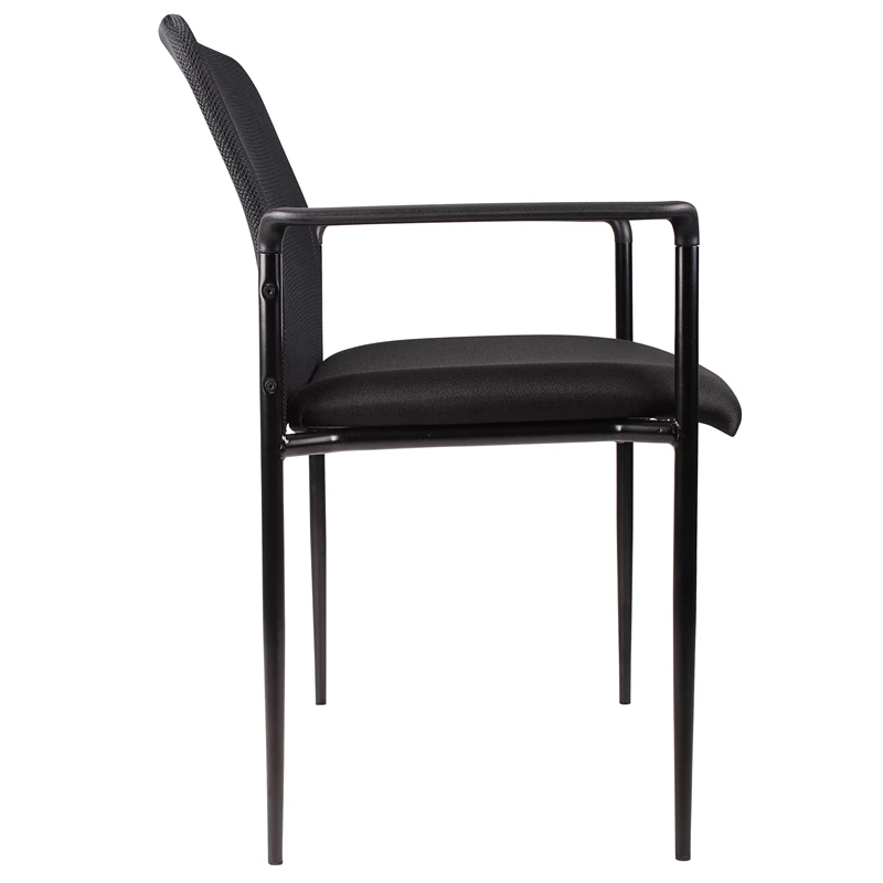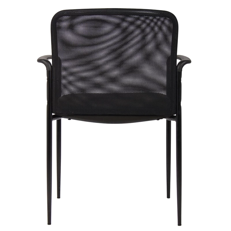 The stackable mesh guest chair in black is the perfect addition to any room or office. For smaller spaces, the chair can be stacked 4 high and stored away when not in use. The chair is at a fixed height with fixed arms and 4 hooded dual wheel casters and is designed with a mesh seat as well as a breathable, airy mesh back. The black chair adds a modern, professional appearance to any space and has a weight limit of 275 lbs.