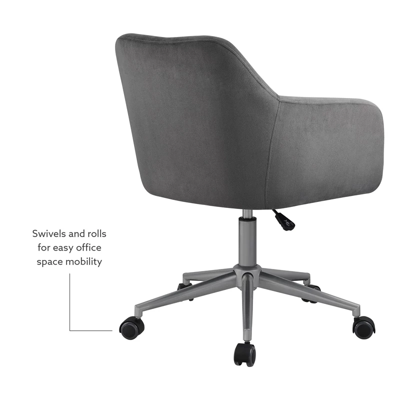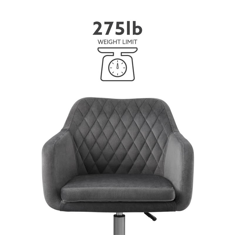 Elegant contemporary styling brings a tailored look to any home office. Comfortable padded seating in a low profile with contoured arms. Expertly upholstered in a soft easy clean grey fabric featuring a quilted pattern on the seat back. Completed with a silver powder coated base and rolling casters that allow for easy movement around your workspace. The adjustable-height seat allows the chair to work with a variety of table heights. Tilt mechanism allows you to lean back or it locks if preferred. Perfect for your home office, makeup vanity or for casual dining. Tilt, adjusting height and base mechanisms meets commercial grade standards for use and durability.