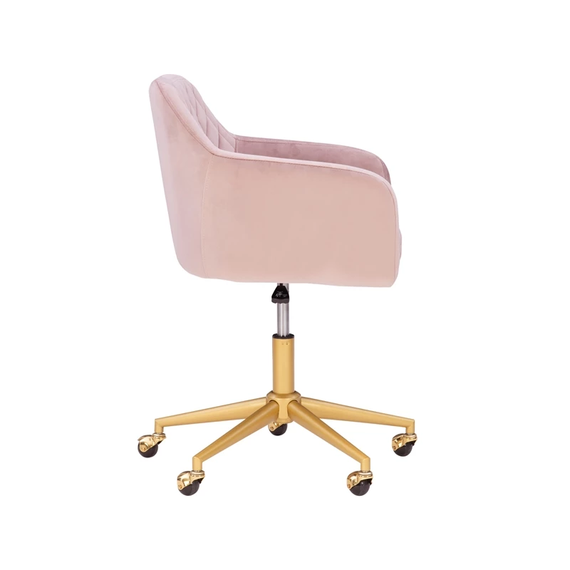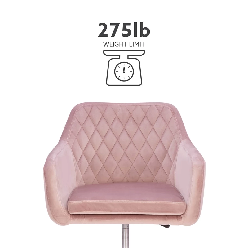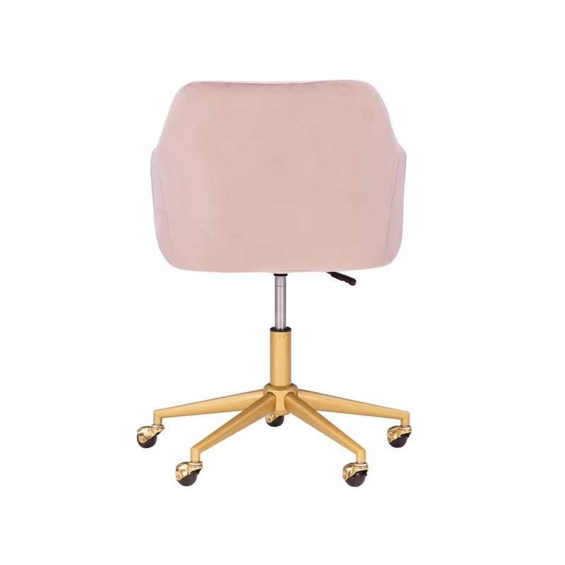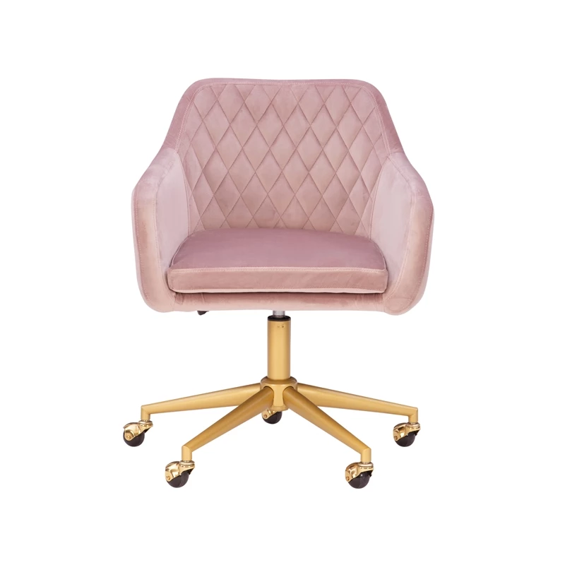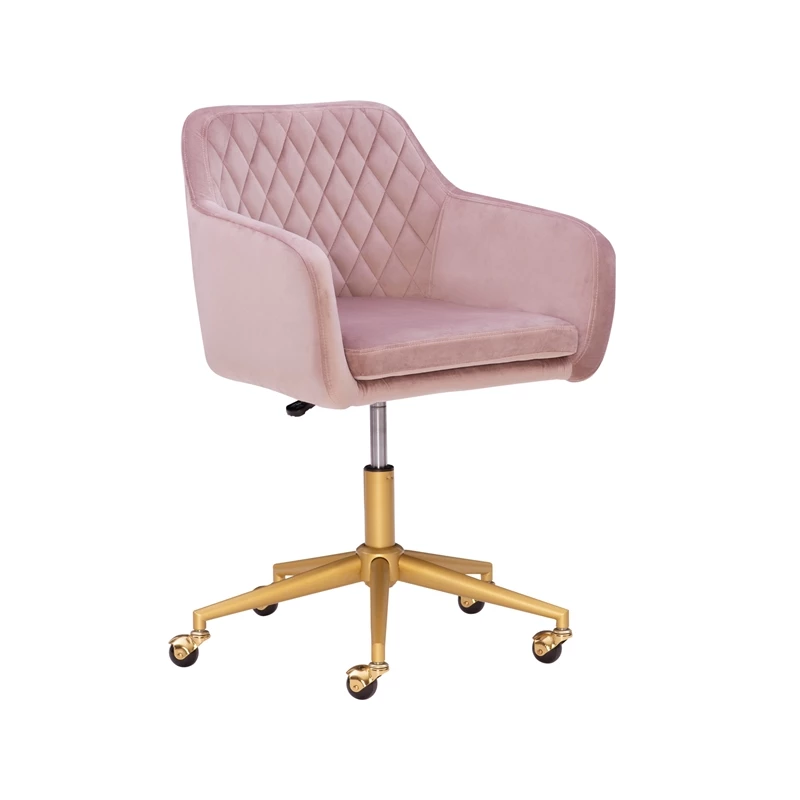 Elegant contemporary styling brings a tailored look to any home office. Comfortable padded seating in a low profile with contoured arms. Expertly upholstered in a soft easy clean soft pink fabric featuring a quilted pattern on the seat back. Completed with a gold powder coated base and rolling casters that allow for easy movement around your workspace. The adjustable-height seat allows the chair to work with a variety of table heights. Tilt mechanism allows you to lean back or it locks if preferred. Perfect for your home office, makeup vanity or for casual dining. Tilt, adjusting height and base mechanisms meets commercial grade standards for use and durability.